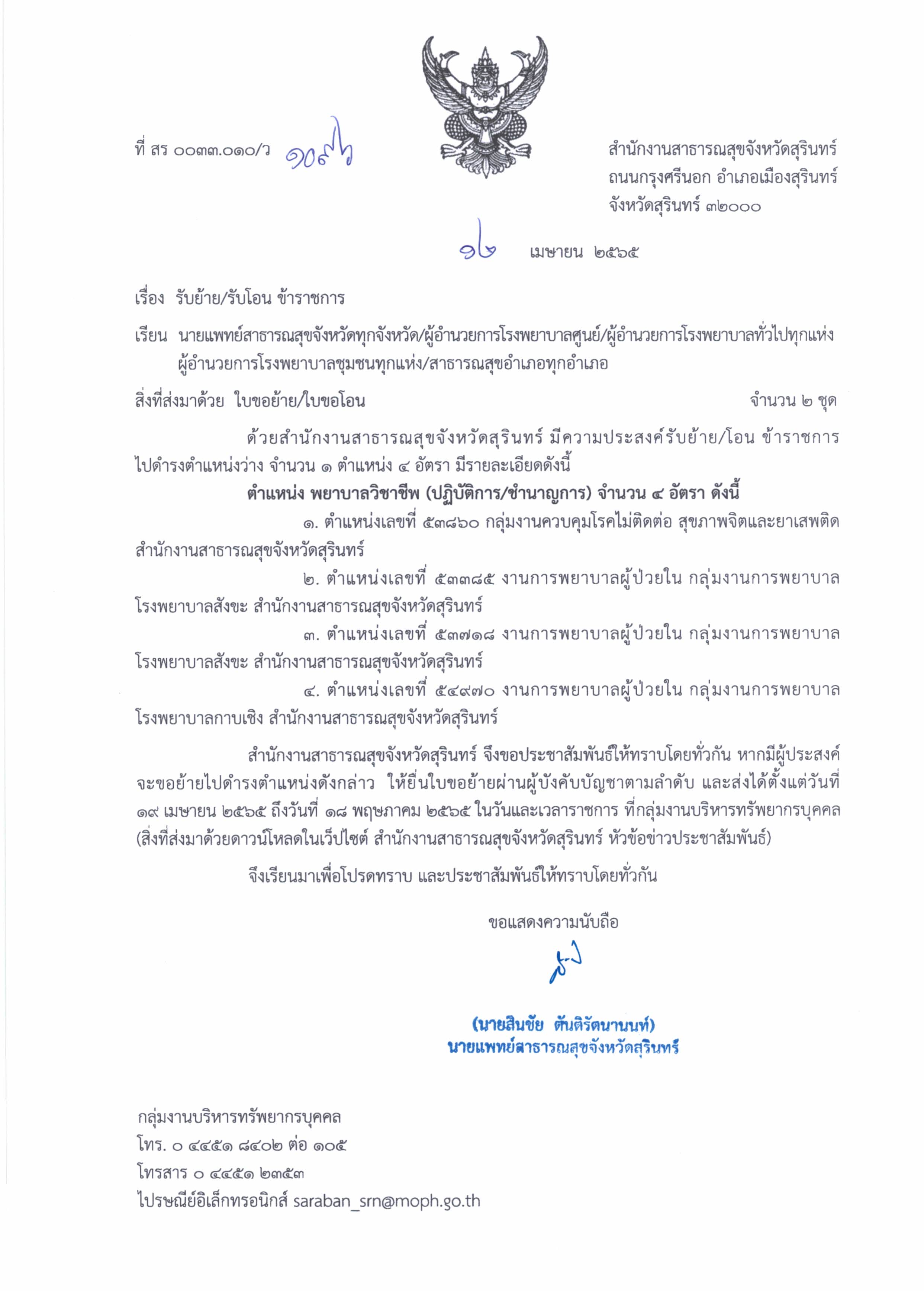 รับย้าย/รับโอน ข้าราชการ ตำแหน่ง พยาบาลวิชาชีพ (ปฏิบัติการ/ชำนาญการ) จำนวน 4 อัตรา สังกัดสำนักงานสาธารณสุขจังหวัดสุรินทร์