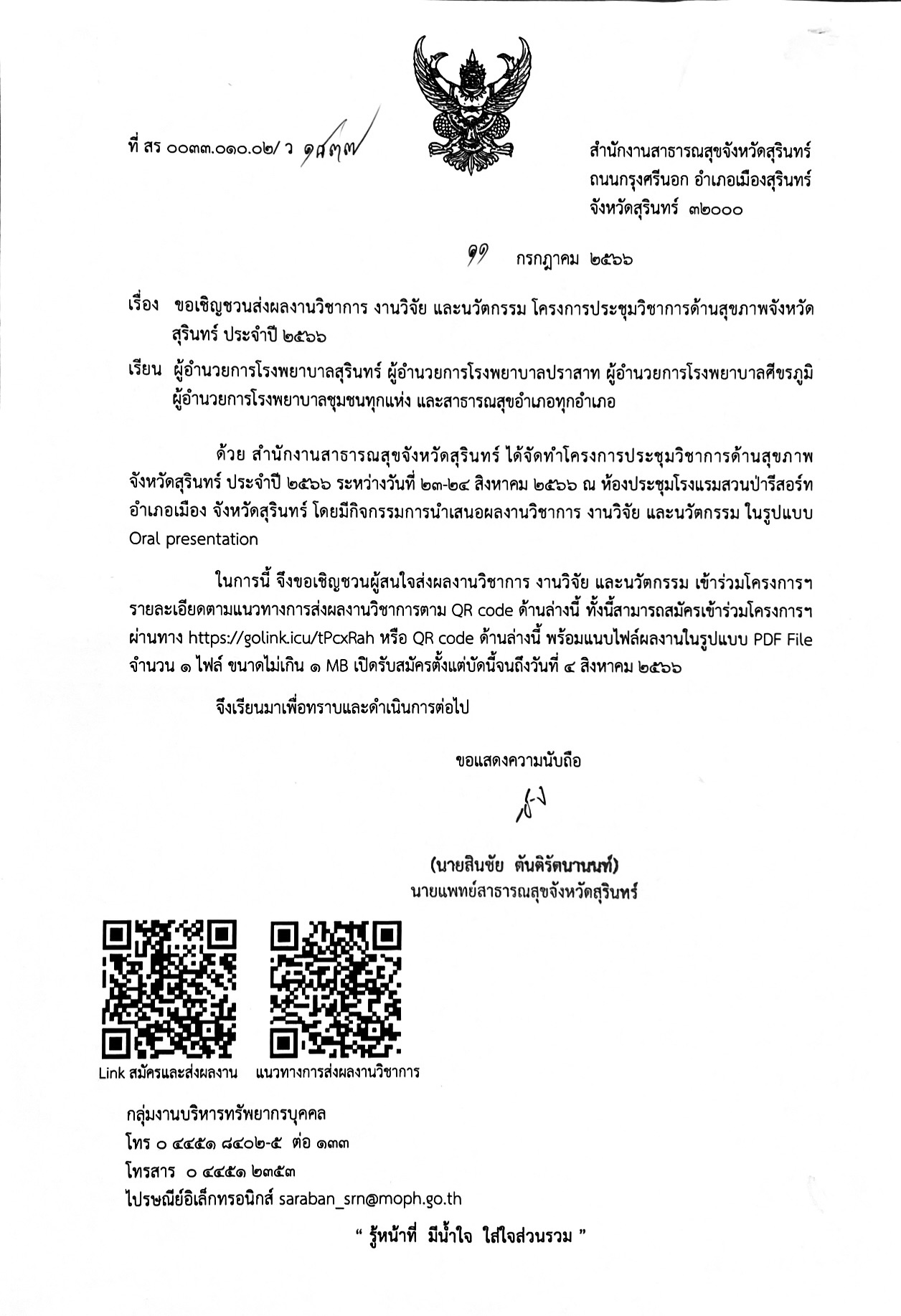 ขอเชิญชวนส่งผลงานวิชาการ งานวิจัย และนวัตกรรมเพื่อนำเสนอในการประชุมวิชาการด้านสุขภาพจังหวัดสุรินทร์ประจำปี2566