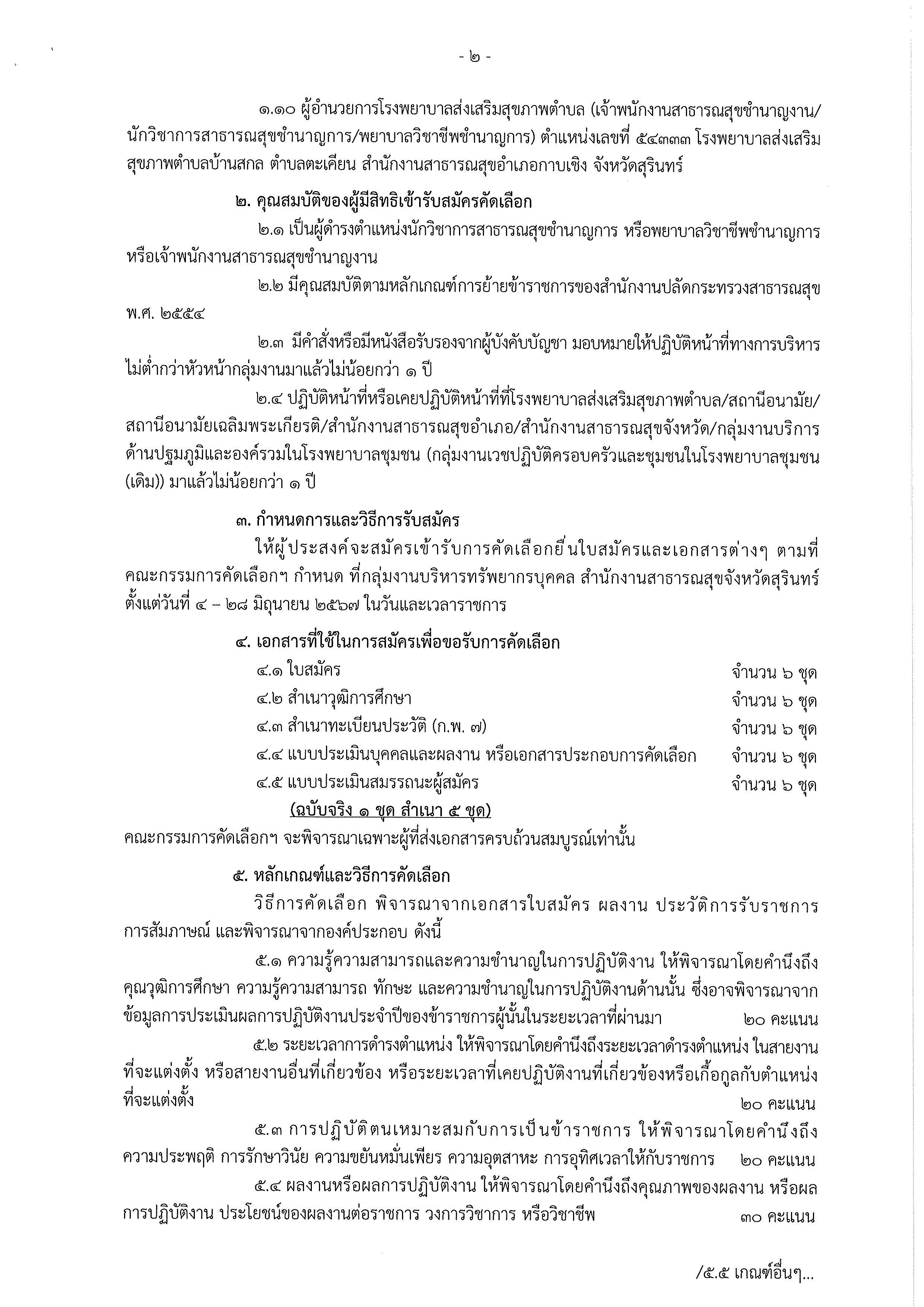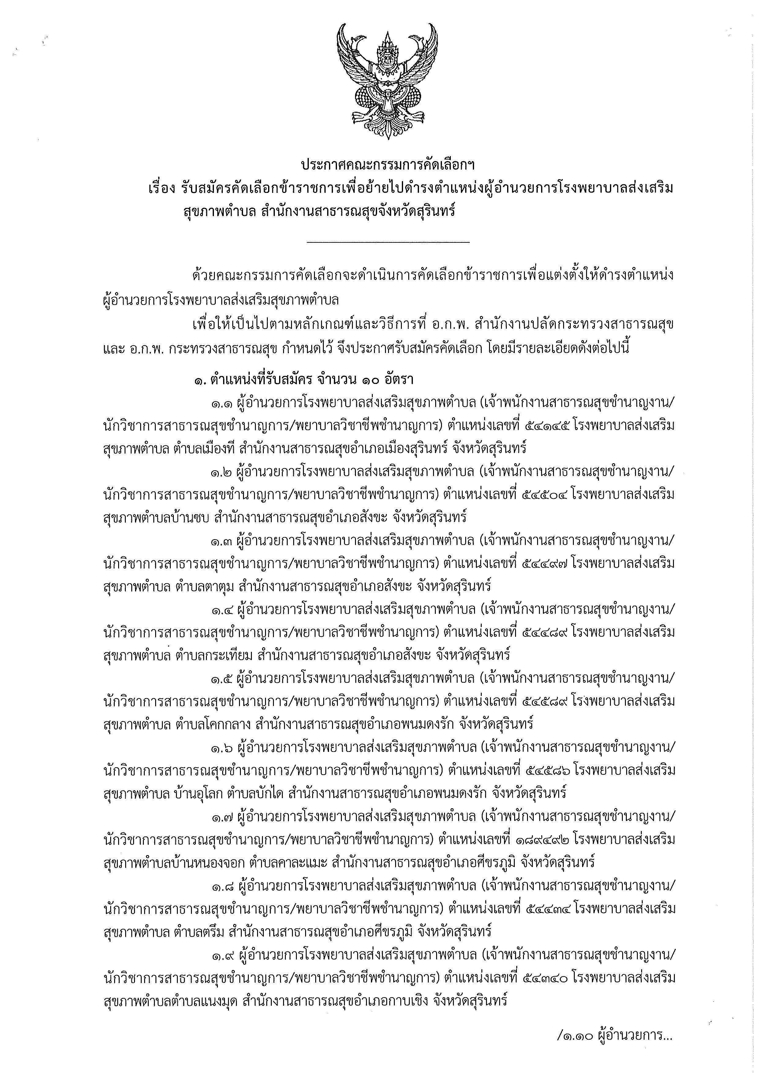 รับสมัครคัดเลือกข้าราชการเพื่อย้ายไปดำรงตำแหน่ง ผอ.รพ.สต. สำนักงานสาธารณสุขจังหวัดสุรินทร์ จำนวน 10 ตำแหน่ง ตามเอกสารที่ปรากฏและเอกสารแนบ