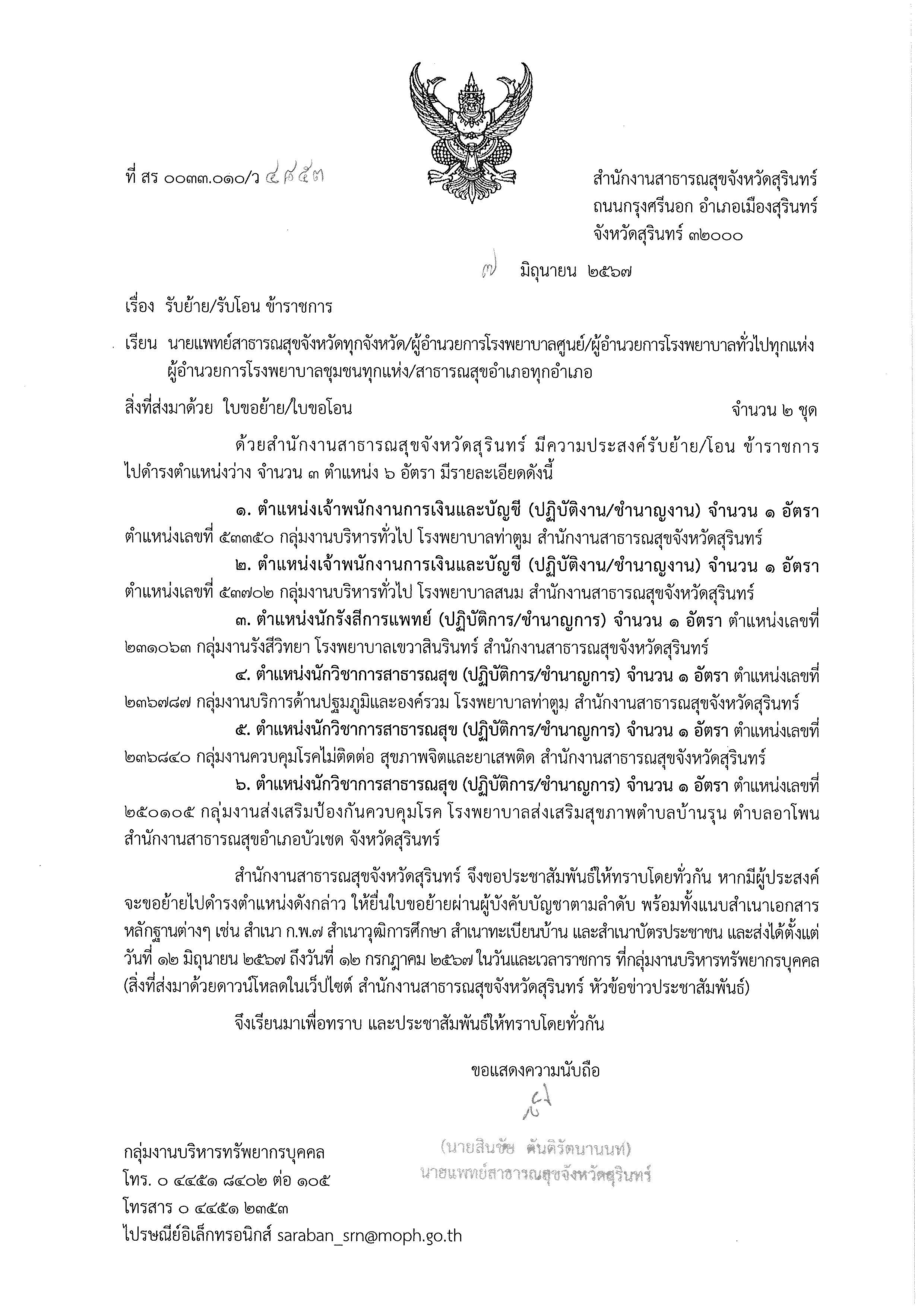 รับย้าย-รับโอน ข้าราชการ มาดำรงตำแหน่งว่าง ในสังกัดสำนักงานสาธารณสุขจังหวัดสุรินทร์ จำนวน 3 ตำแหน่ง 6 อัตรา รายละเอียดตามเอกสารแนบ