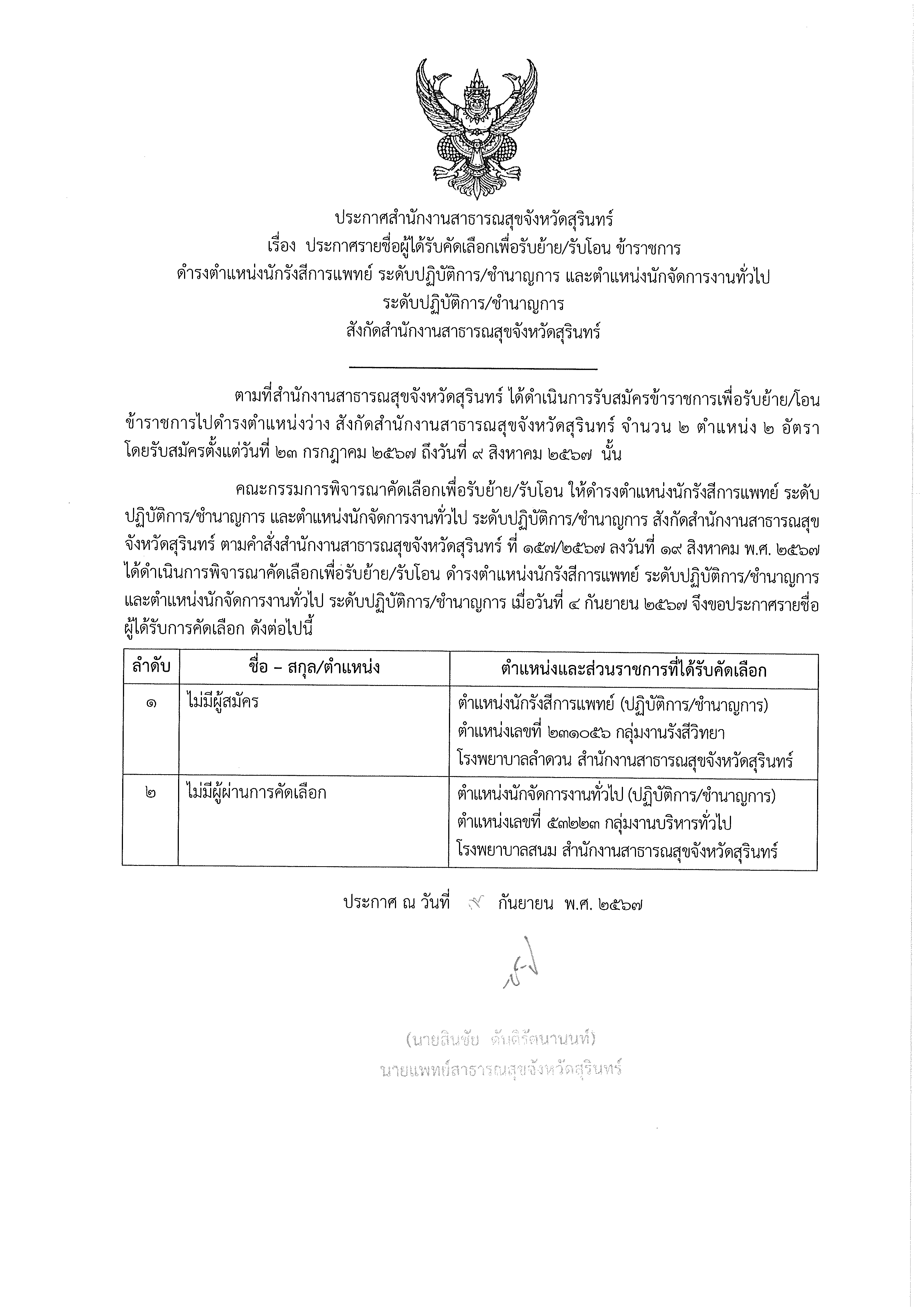 ประกาศรายชื่อผู้ได้รับคัดเลือกเพื่อรับย้าย/รับโอน ข้าราชการ ดำรงตำแหน่งนักรังสีการแพทย์ ระดับปฏิบัติการ/ชำนาญการ และตำแหน่งนักจัดการงานทั่วไป ระดับปฏิบัติการ/ชำนาญการ