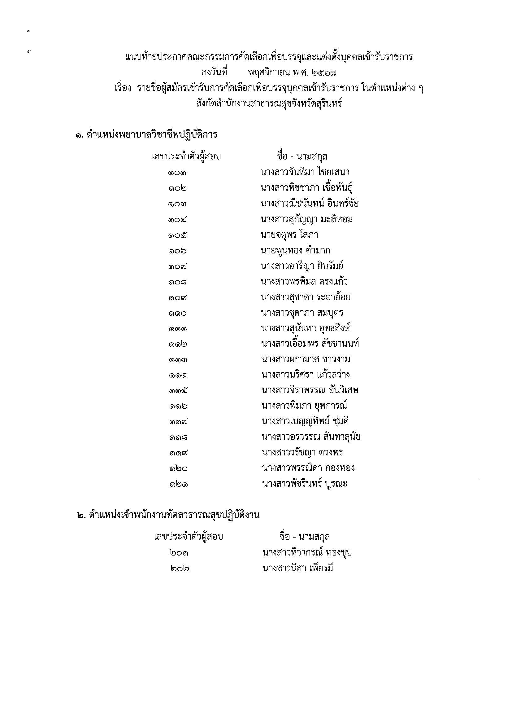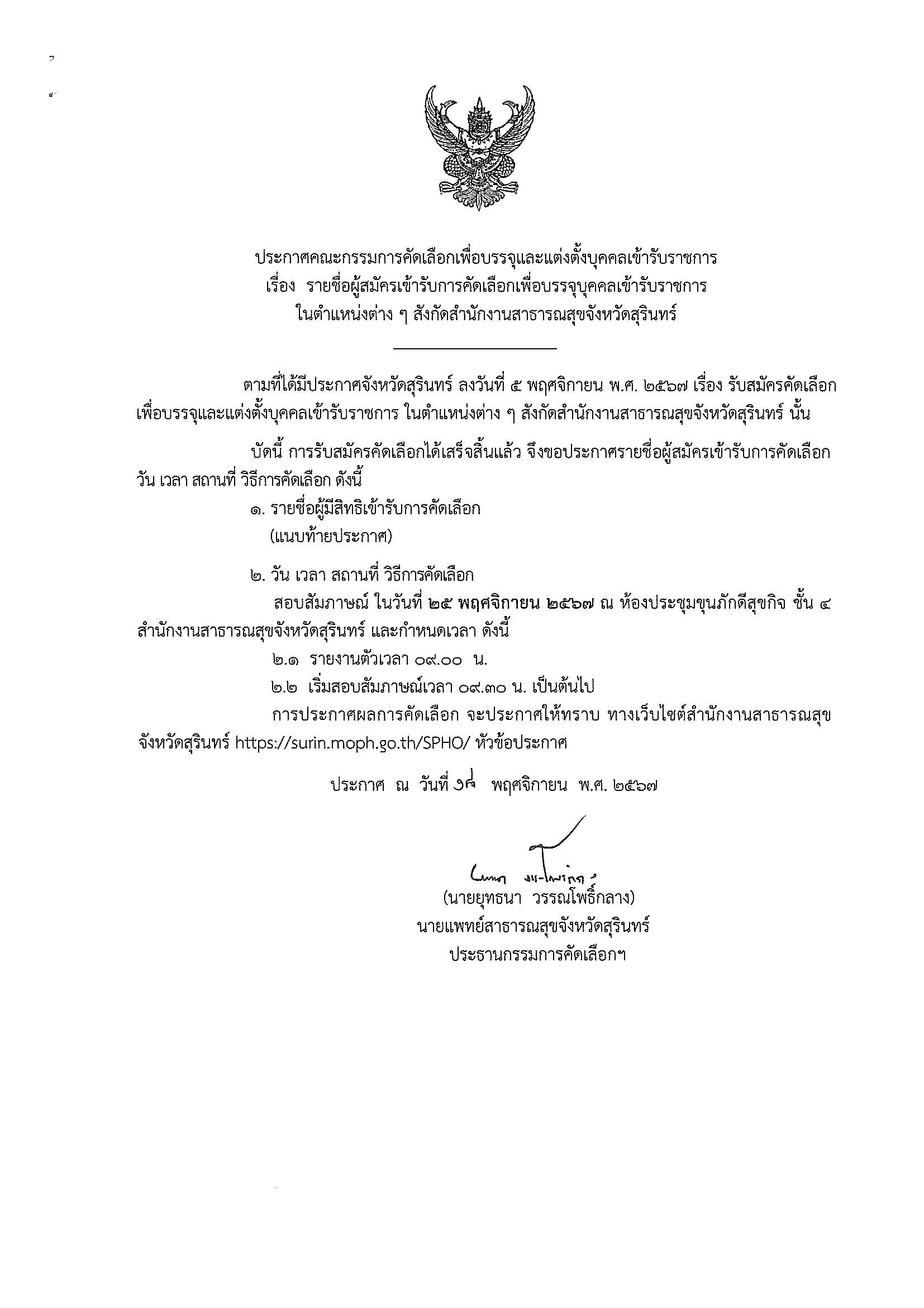 ประกาศรายชื่อผู้สมัครเข้ารับการคัดเลือกเพื่อบรรจุราชการ สสจ.สุรินทร์