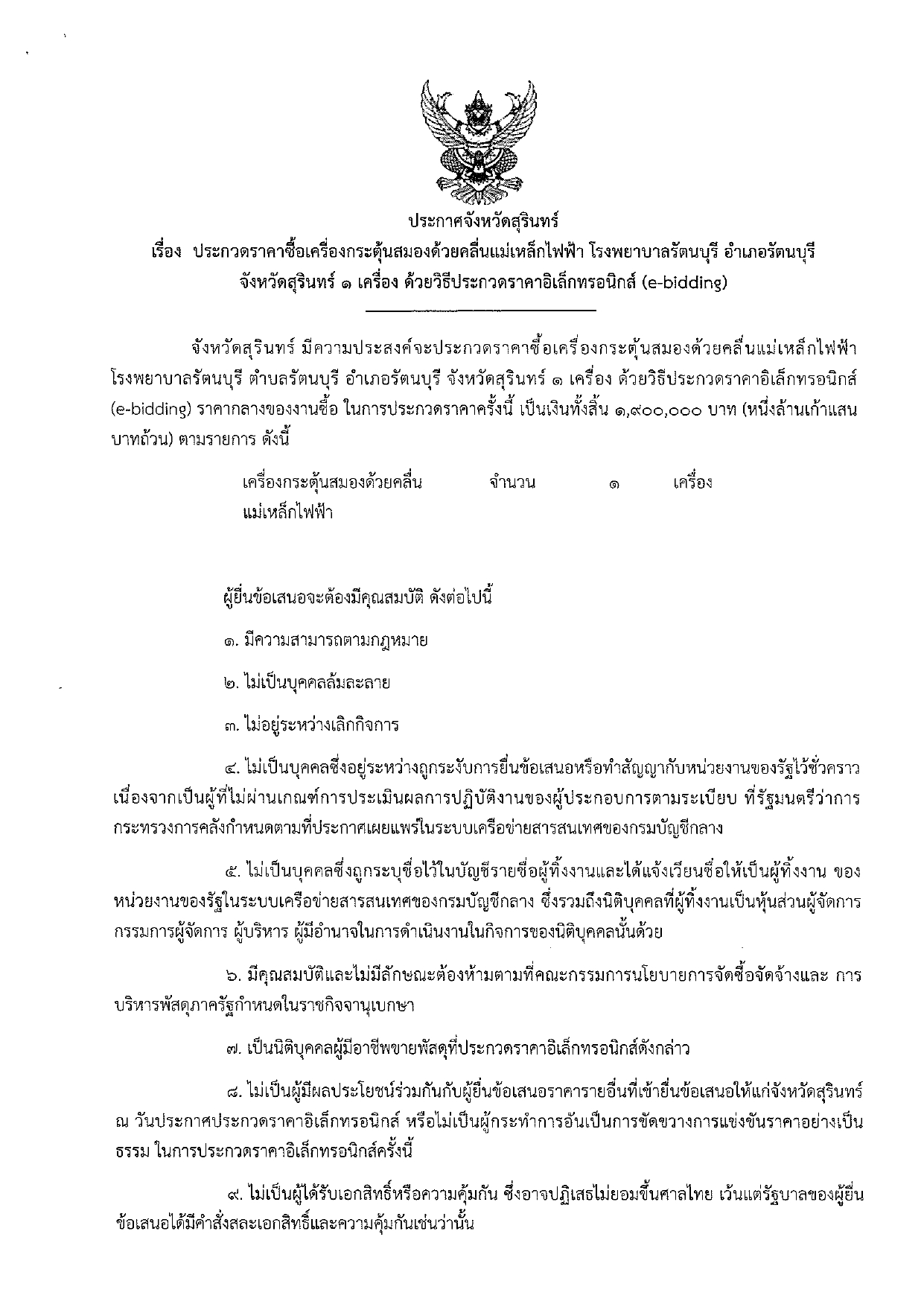 ประกาศจังหวัดสุรินทร์ เรื่องประกวดราคาซื้อเครื่องกรุตุ้นสมองด้วยคลื่นแม่เหล็กไฟฟ้า โรงพยาบาลรัตนบุรี อำเภอรัตนบุรี จังหวัดสุรินทร์ 1 เครื่อง ด้วยวิธีประกวดราคาอิเล็กทรอนิกส์ (e-bidding)