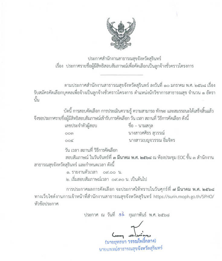 ประกาศรายชื่อผู้มีสิทธิสอบสัมภาษณ์นักวิชาการสาธารณสุข