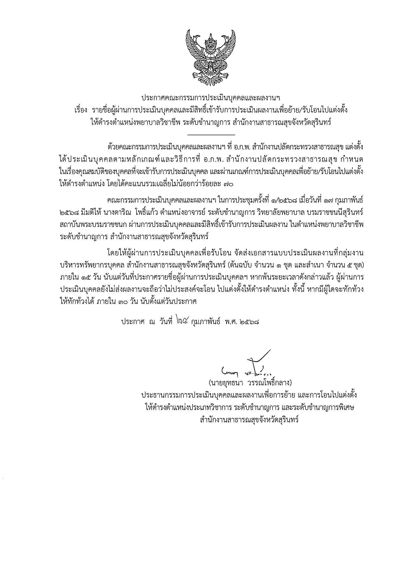 รายชื่อผู้ผ่านการประเมินบุคคลและมีสิทธิ์เข้ารับการประเมินผลงานเพื่อย้าย/รับโอน ไปแต่งตั้งให้ดำรงตำแหน่งพยาบาลวิชาชีพ ระดับชำนาญการ สำนักงานสาธารณสุขจังหวัดสุรินทร์