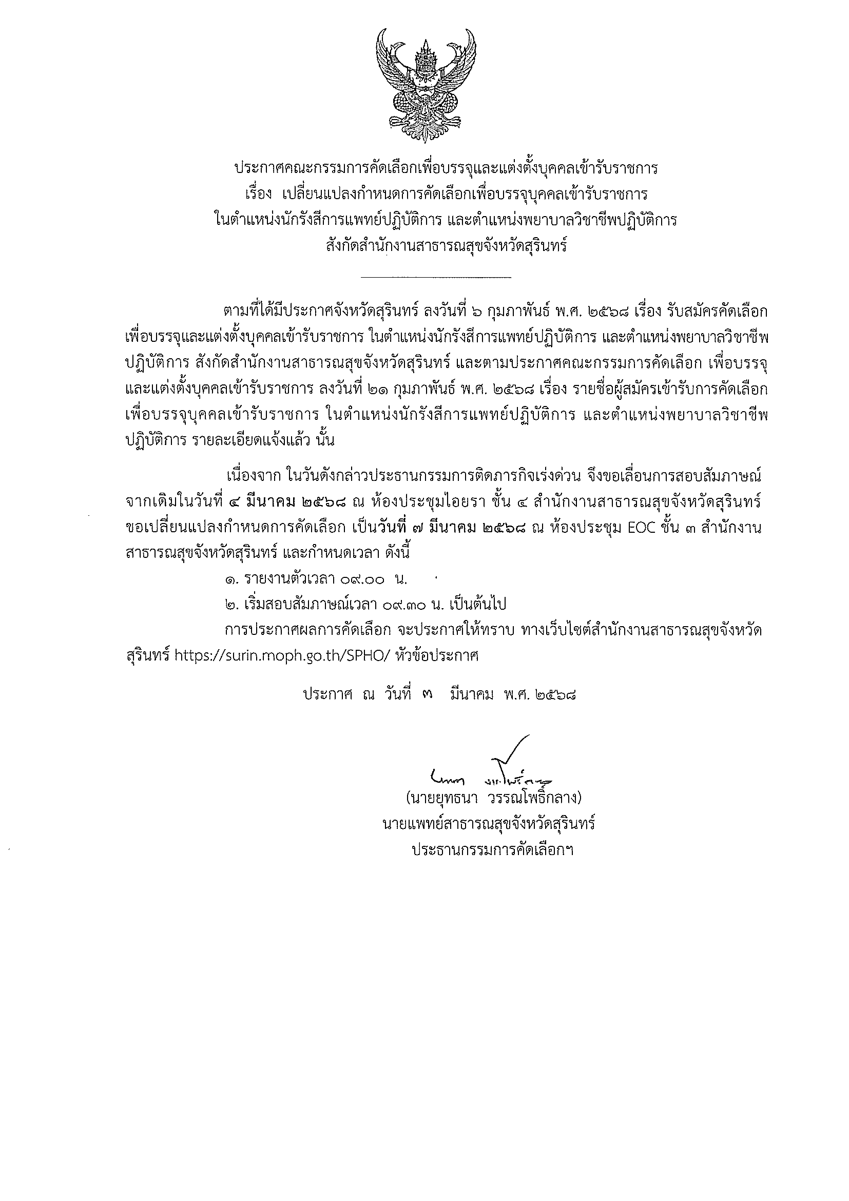 เปลี่ยนแปลงกำหนดการคัดเลือกเพื่อบรรจุบุคคลเข้ารับราชการ นักรังสีการแพทย์ปฏิบัติการ พยาบาลวิชาชีพปฏิบัติการ ในสังกัดาำนักงานสาธารณสุขจังหวัดสุรินทร์