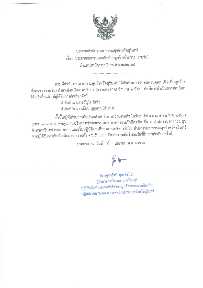 ประกาศผลการสอบคัดเลือกลูกจ้างชั่วคราวรายวัน พนักงานบริการ (ความสะอาด)