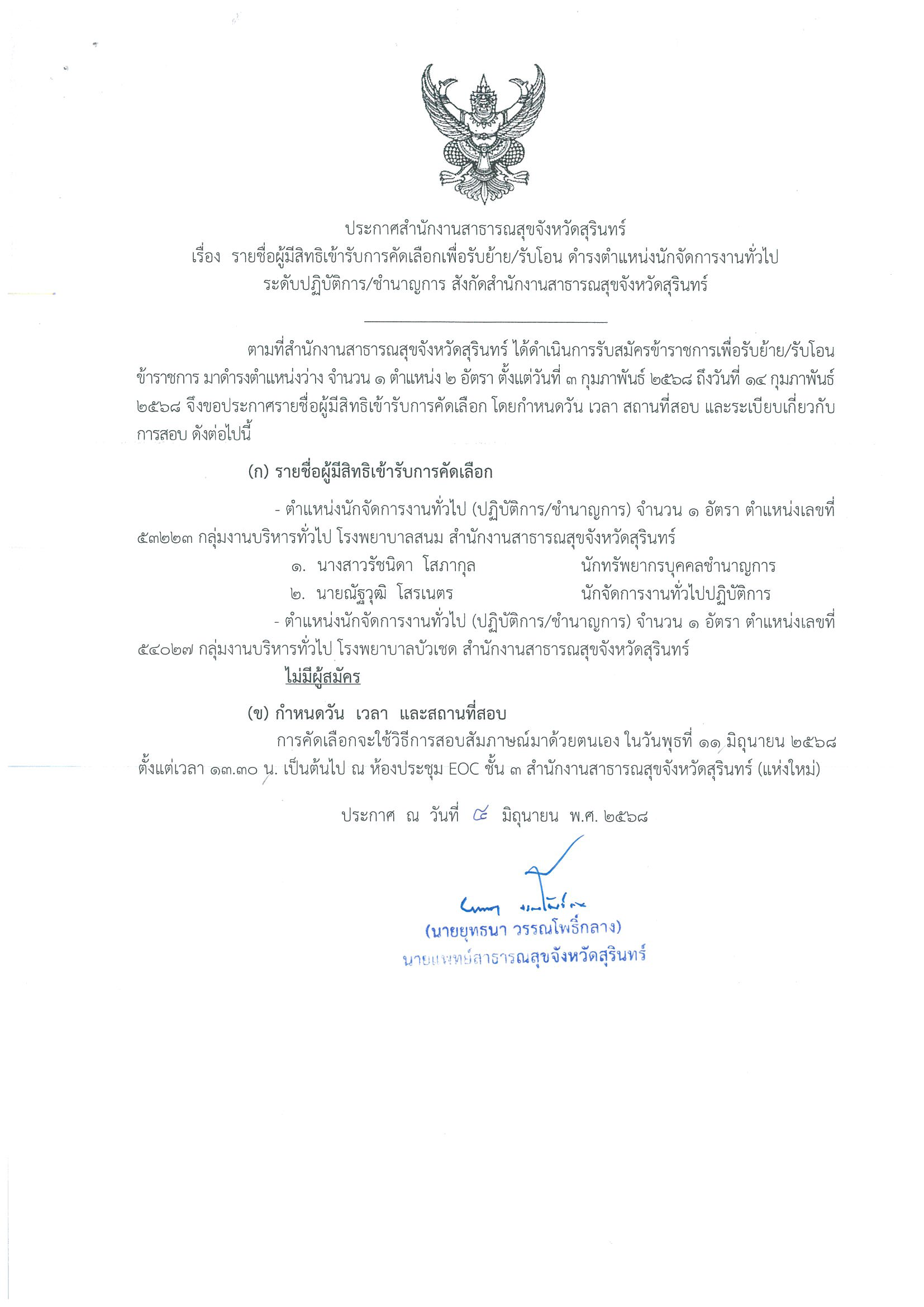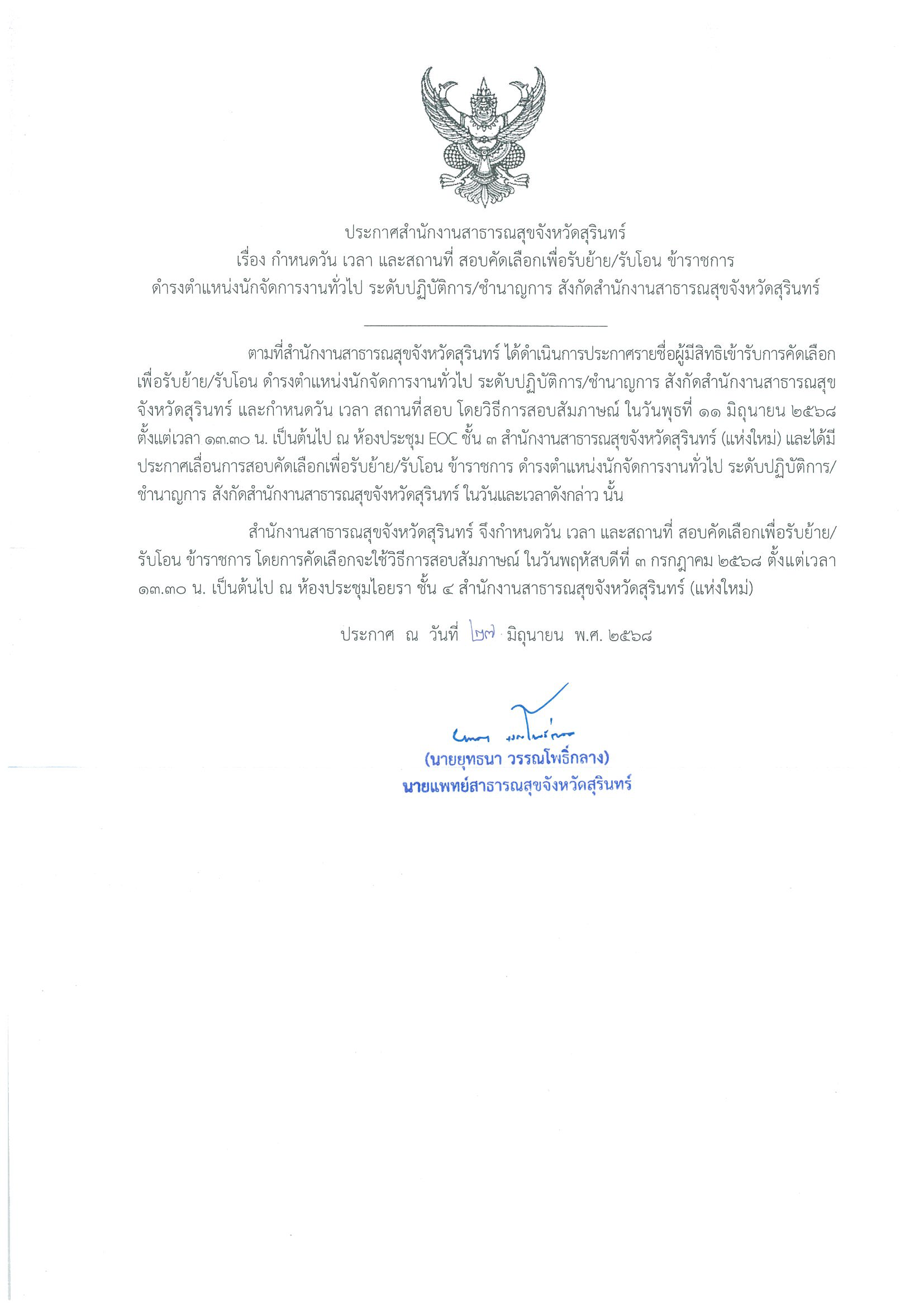 ประกาศกำหนดวัน เวลา และสถานที่ สอบคัดเลือกเพื่อรับย้าย/รับโอน ข้าราชการ ดำรงตำแหน่งนักจัดการงานทั่วไป ระดับปฏิบัติการ/ชำนาญการ สังกัดสำนักงานสาธารณสุขจังหวัดสุรินทร์ รายละเอียดปรากฏดังนี้ สามารถดาวน์โหลดได้ที่เอกสารแนบ