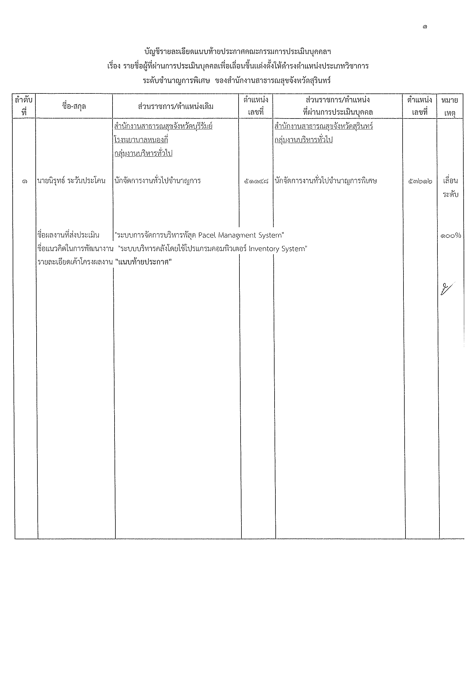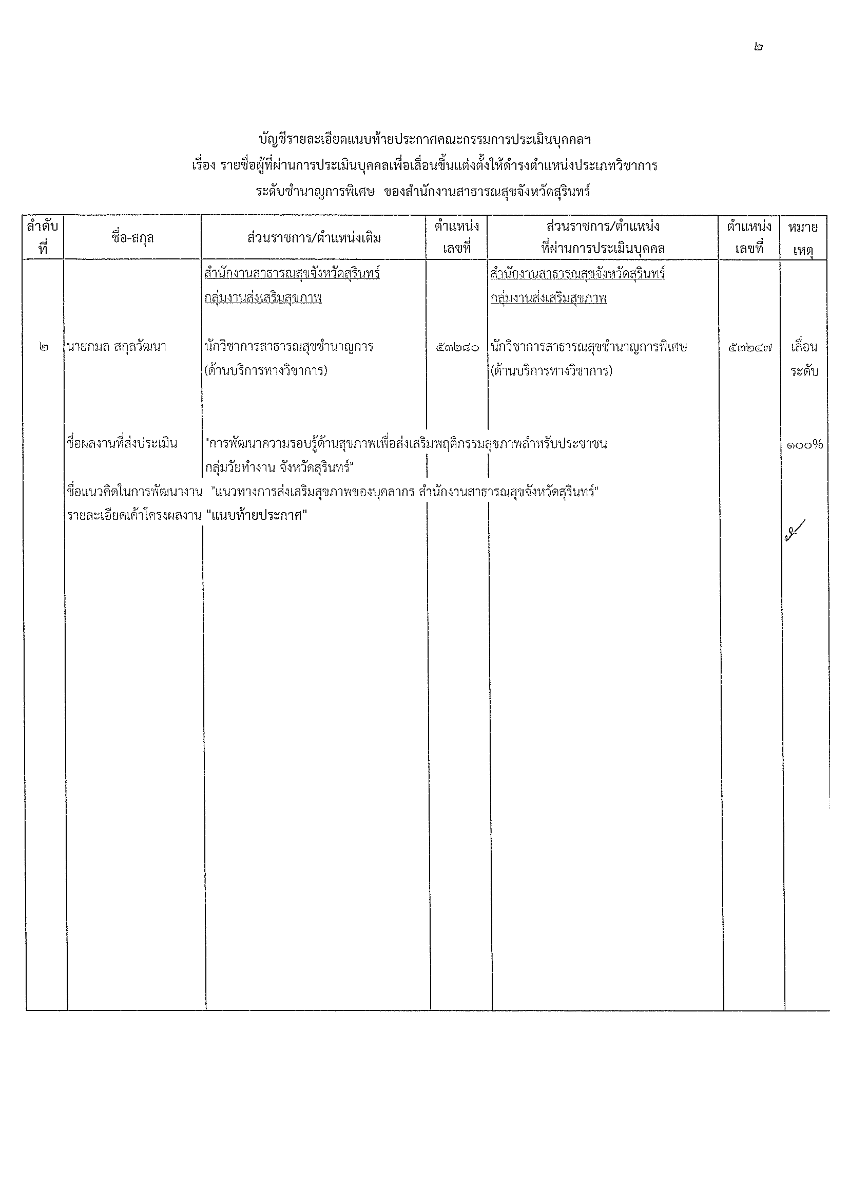 ประกาศคณะกรรมการประเมินบุคคล เรื่อง รายชื่อผู้ที่ผ่านการประเมินบุคคลเพื่อเลื่อนขึ้นแต่งตั้งให้ดำรงตำแหน่งประเภทวิชาการระดับชำนาญการพิเศษ สสจ.สุรินทร์