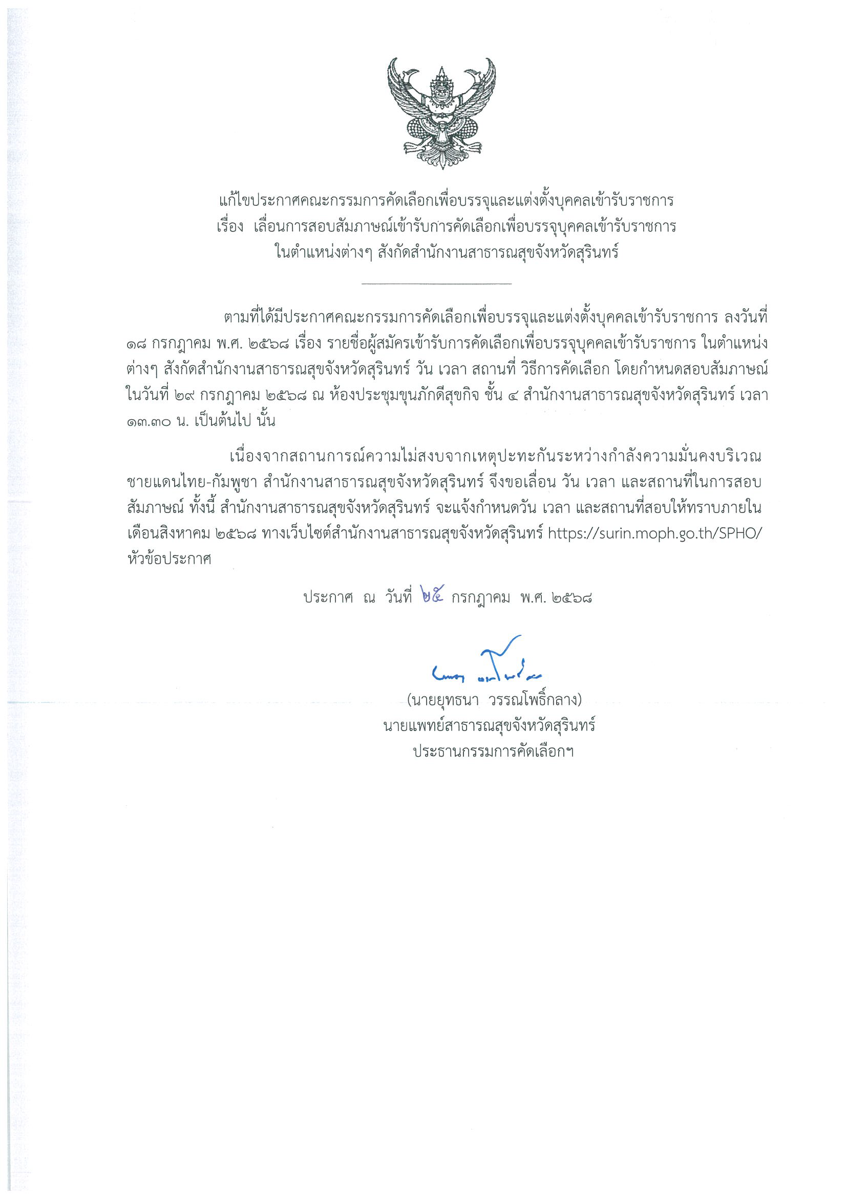 แก้ไขประกาศคณะกรรมการคัดเลือกเพื่อบรรจุและแต่งตั้งบุคคลเข้ารบราชการ เรื่อง เลื่อนสอบสัมภาษณ์การเข้ารีบการคัดเลือกเพื่อบรรจุบุคคลเข้ารับราชการ ในตำแหน่งต่างๆ สังกัดสำนักงานสาธารณสุขจังหวัดสุรินทร์