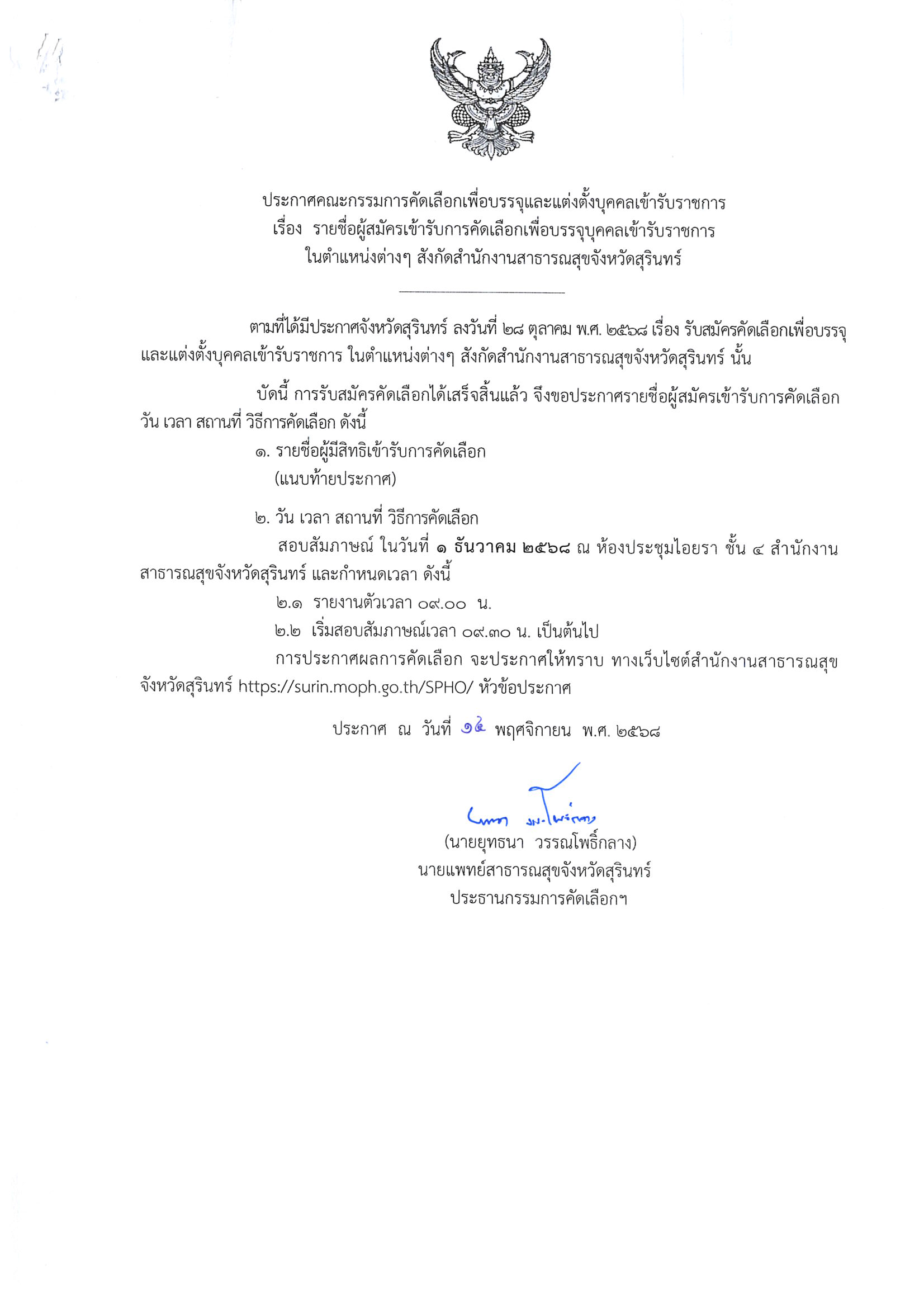 ประกาศรายชื่อผู้สมัครเข้ารับการคัดเลือกเพื่อบรรจุและแต่งตั้งบุคคลเข้ารับราชการในตำแหน่งต่างๆ สังกัด สสจ.สุรินทร์ รายละเอียดสามารถกดปุ่ม "ดาวน์โหลด"
