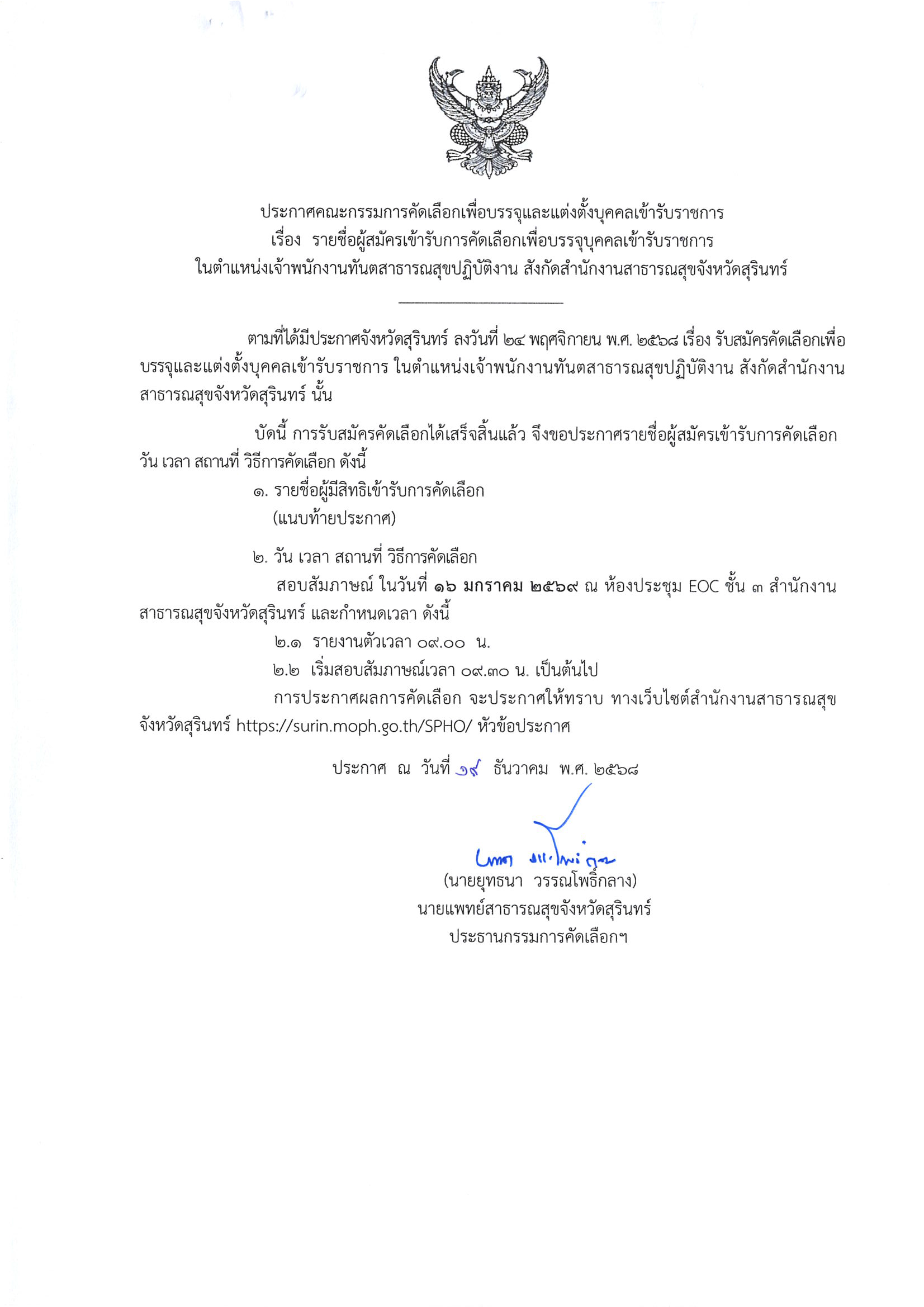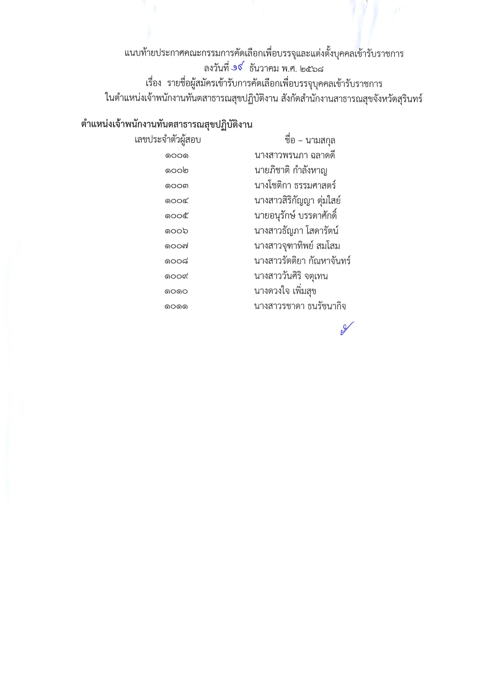 ประกาศรายชื่อผู้มีสิทธิเข้ารับการคัดเลือกฯ จพ.ทันตสาธารณสุขปฏิบัติงาน