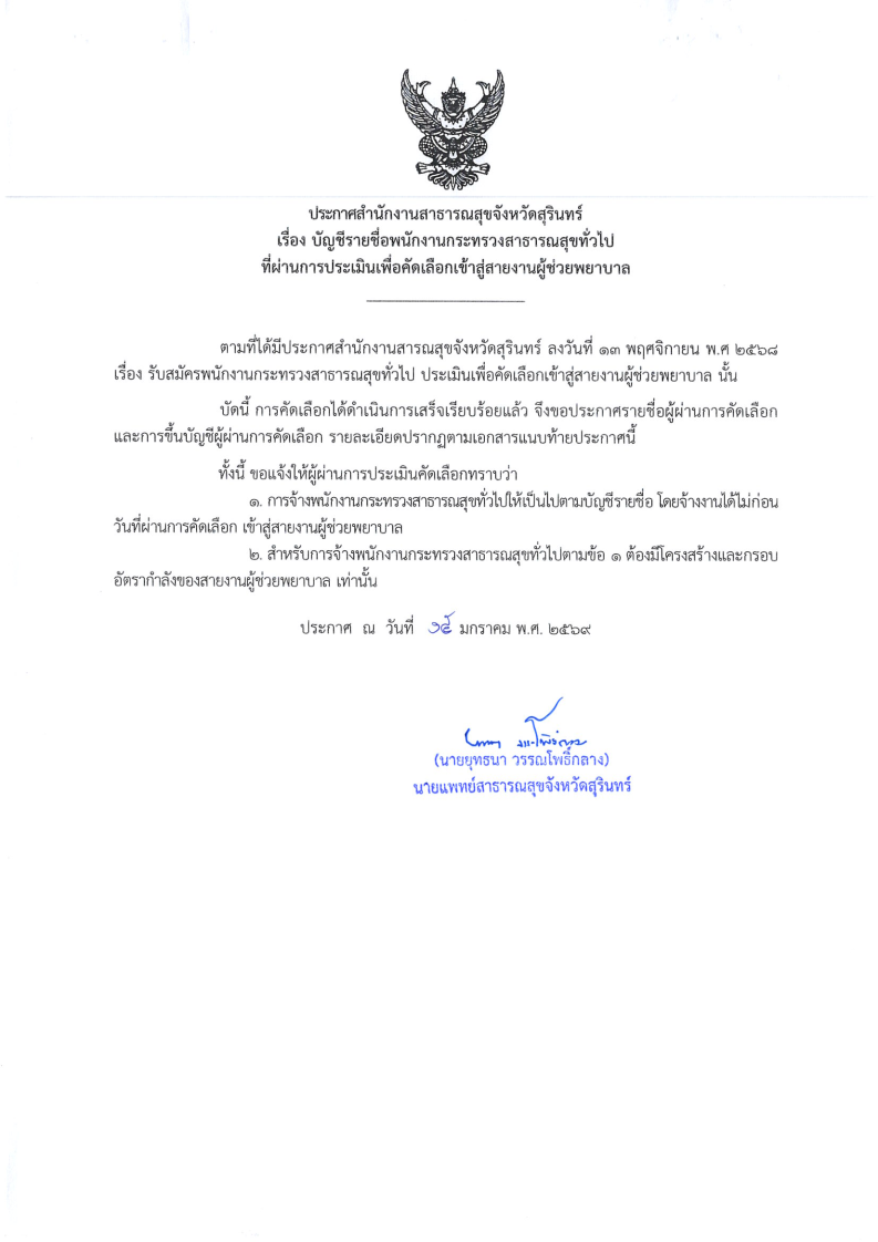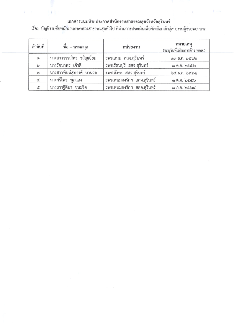 ประกาศบัญชีรายชื่อพนักงานกระทรวงสาธารณสุขทั่วไป ที่ผ่านการประเมินเพื่อคัดเลือกเข้าสู่สายงานผู้ช่วยพยาบาล รายละเอียดตามเอกสาร
