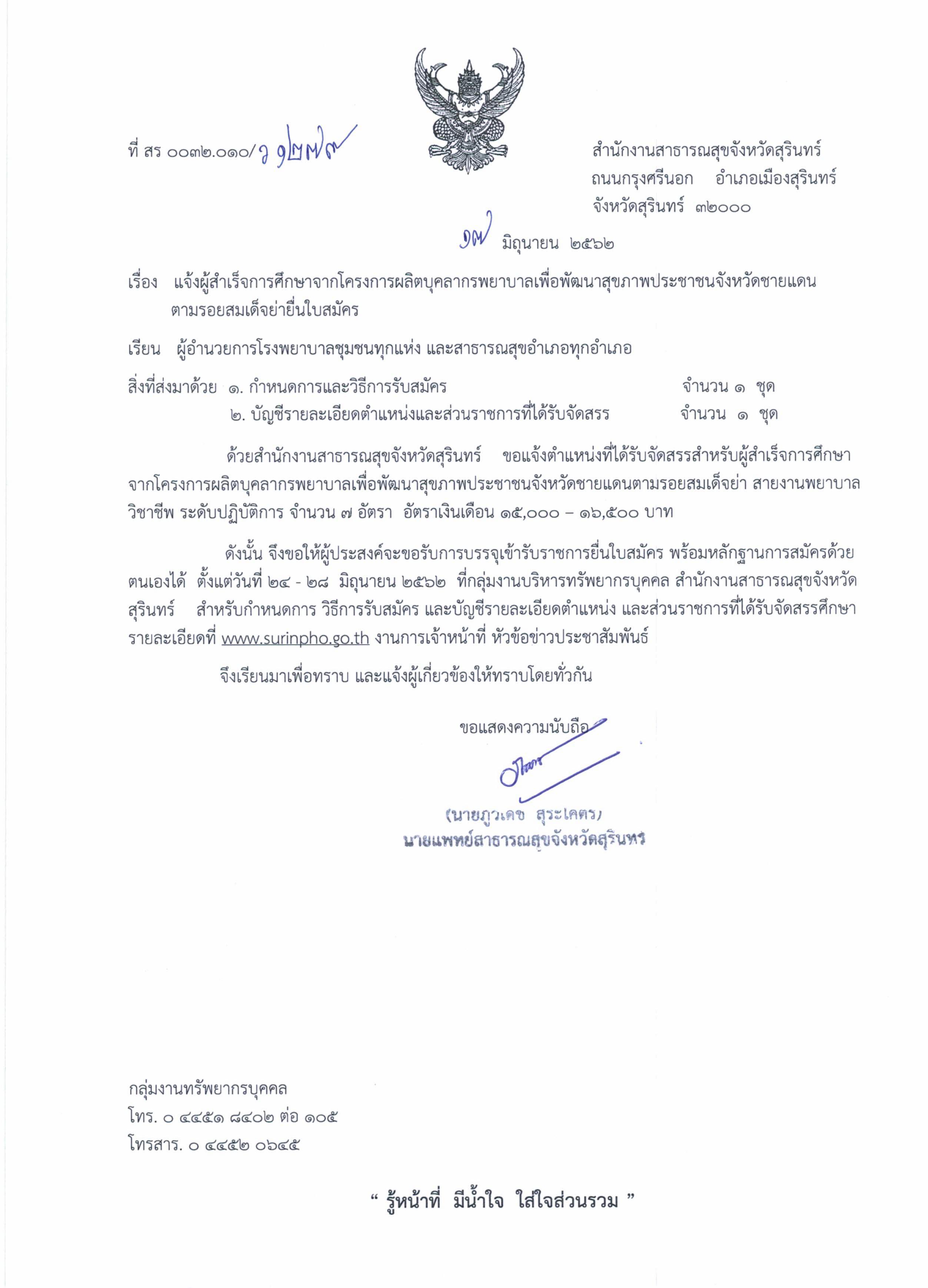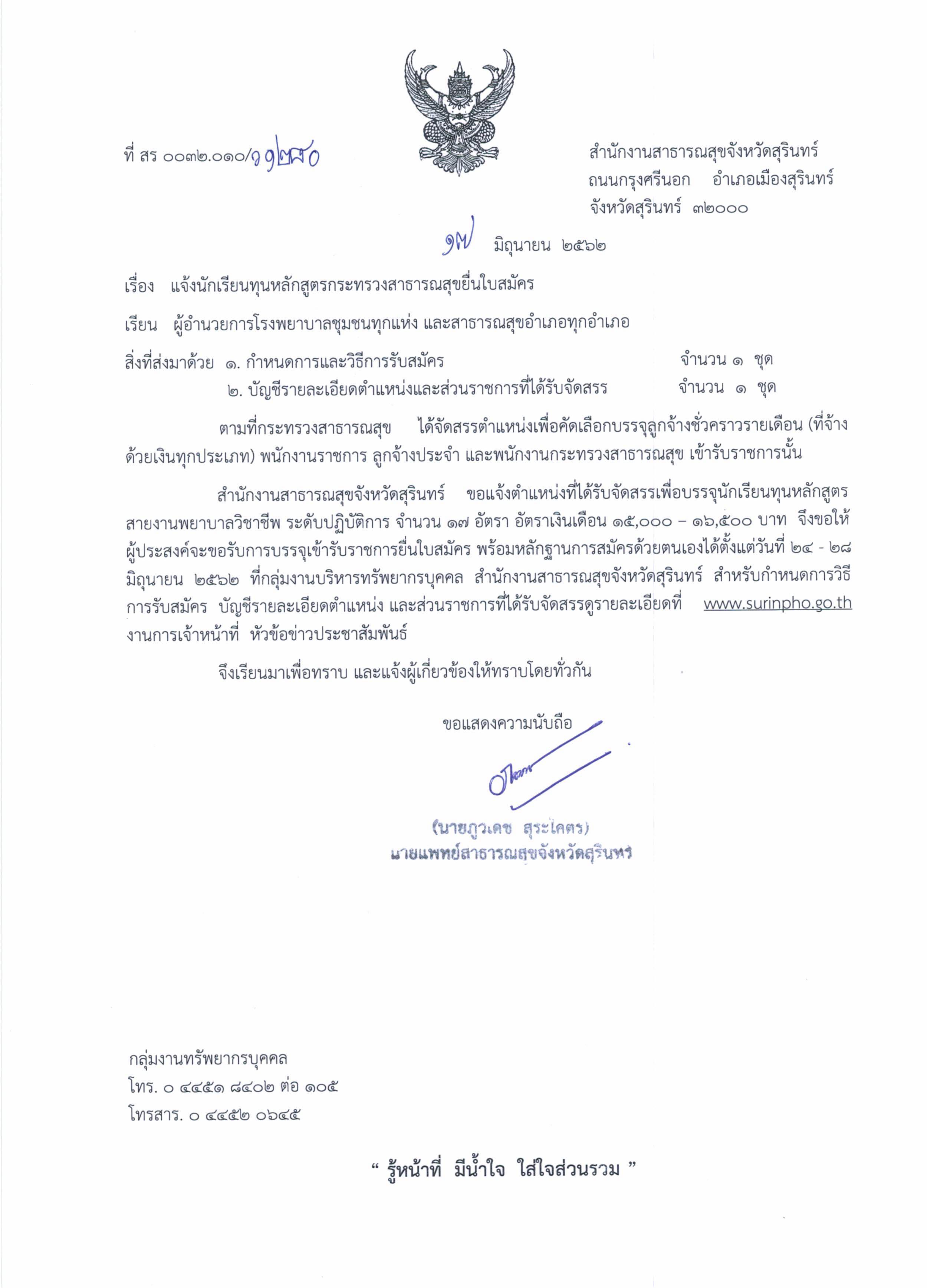 แจ้งนักเรียนทุนหลักสูตรกระทรวงสาธารณสุขยื่นใบสมัครเข้ารับราชการ ตั้งแต่วันที่ 24 - 28 มิ.ย. 62