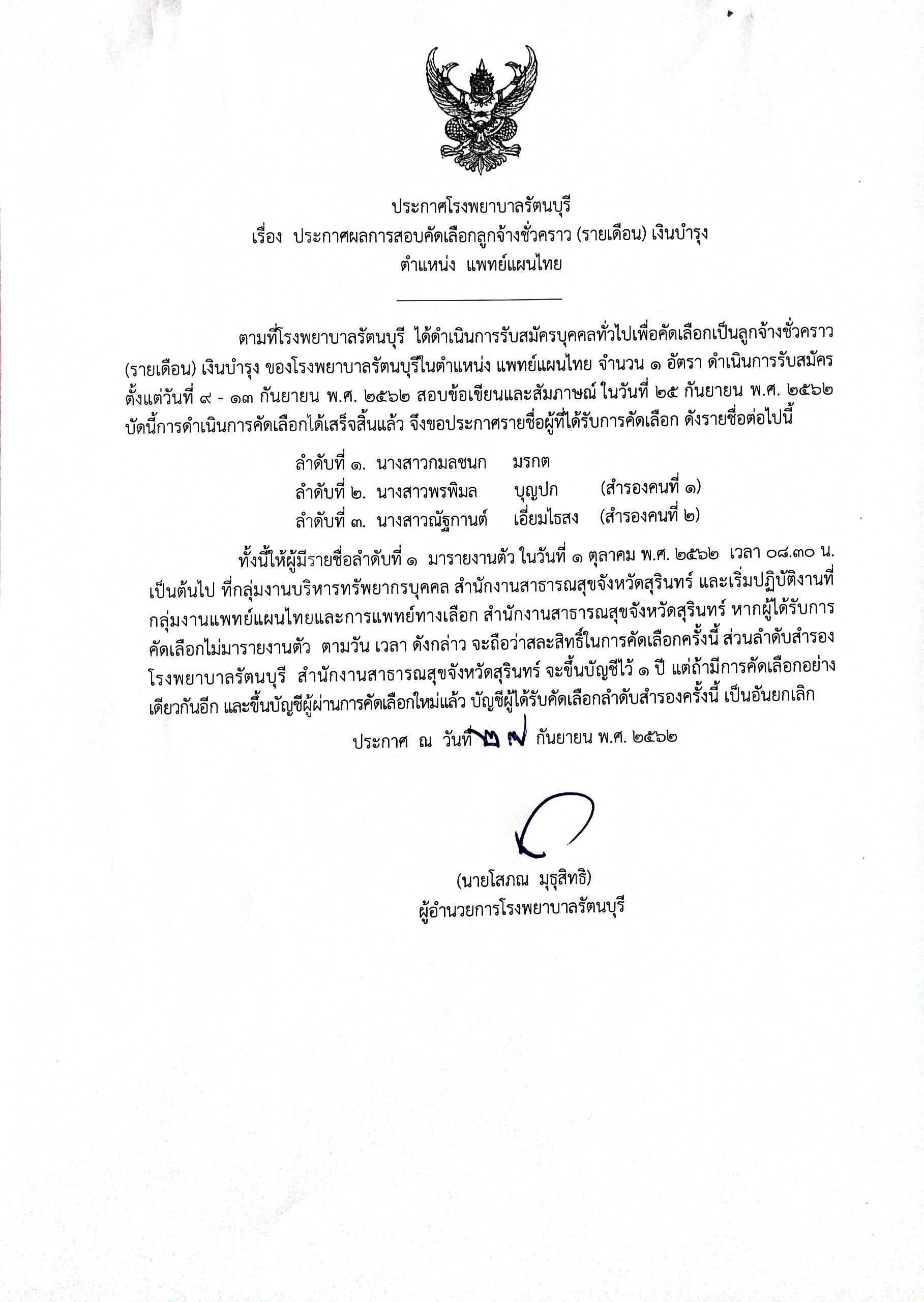 ประกาศผลการสอบคัดเลือกลูกจ้างชั่วคราว ตำแหน่งแพทย์แผนไทย