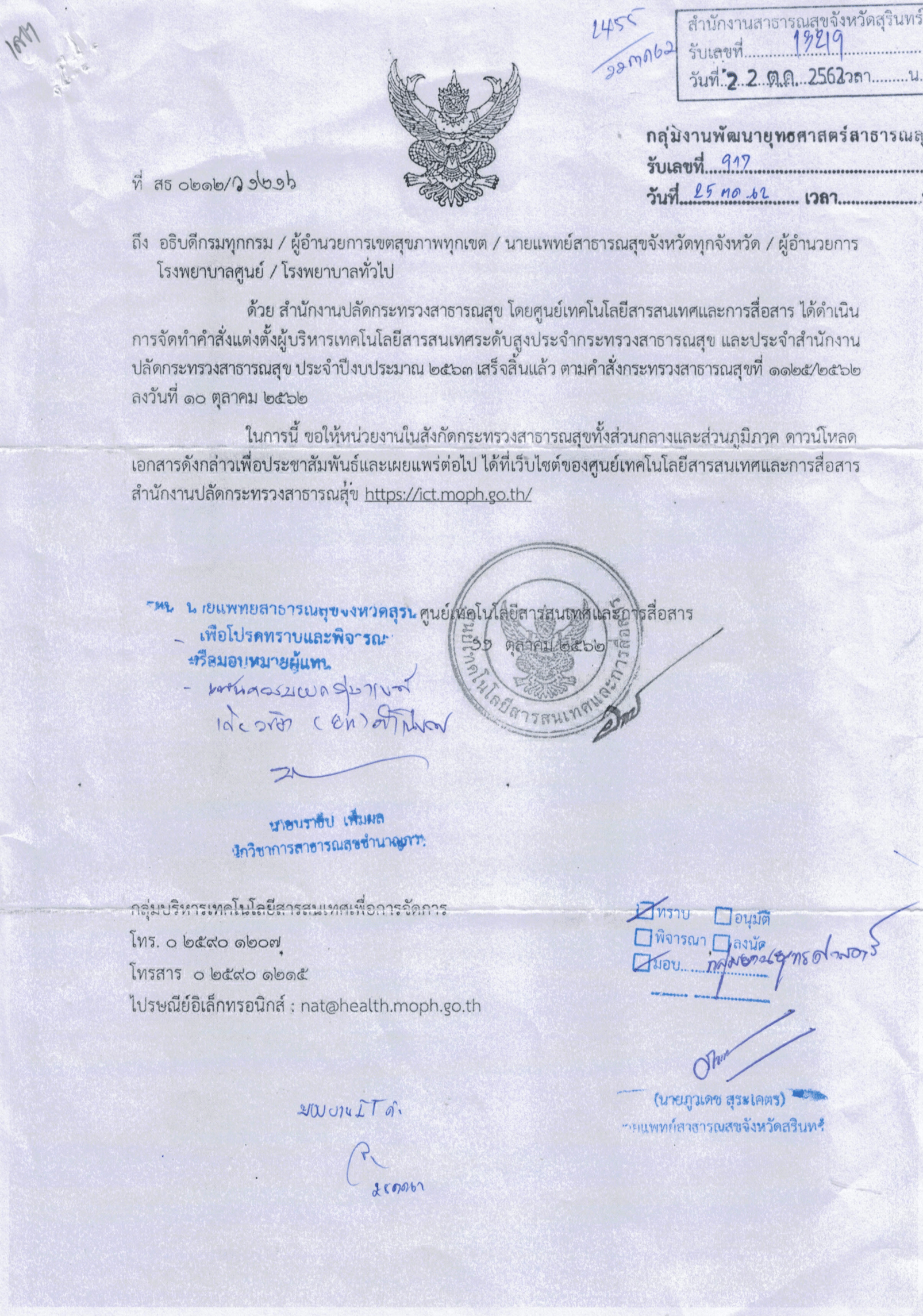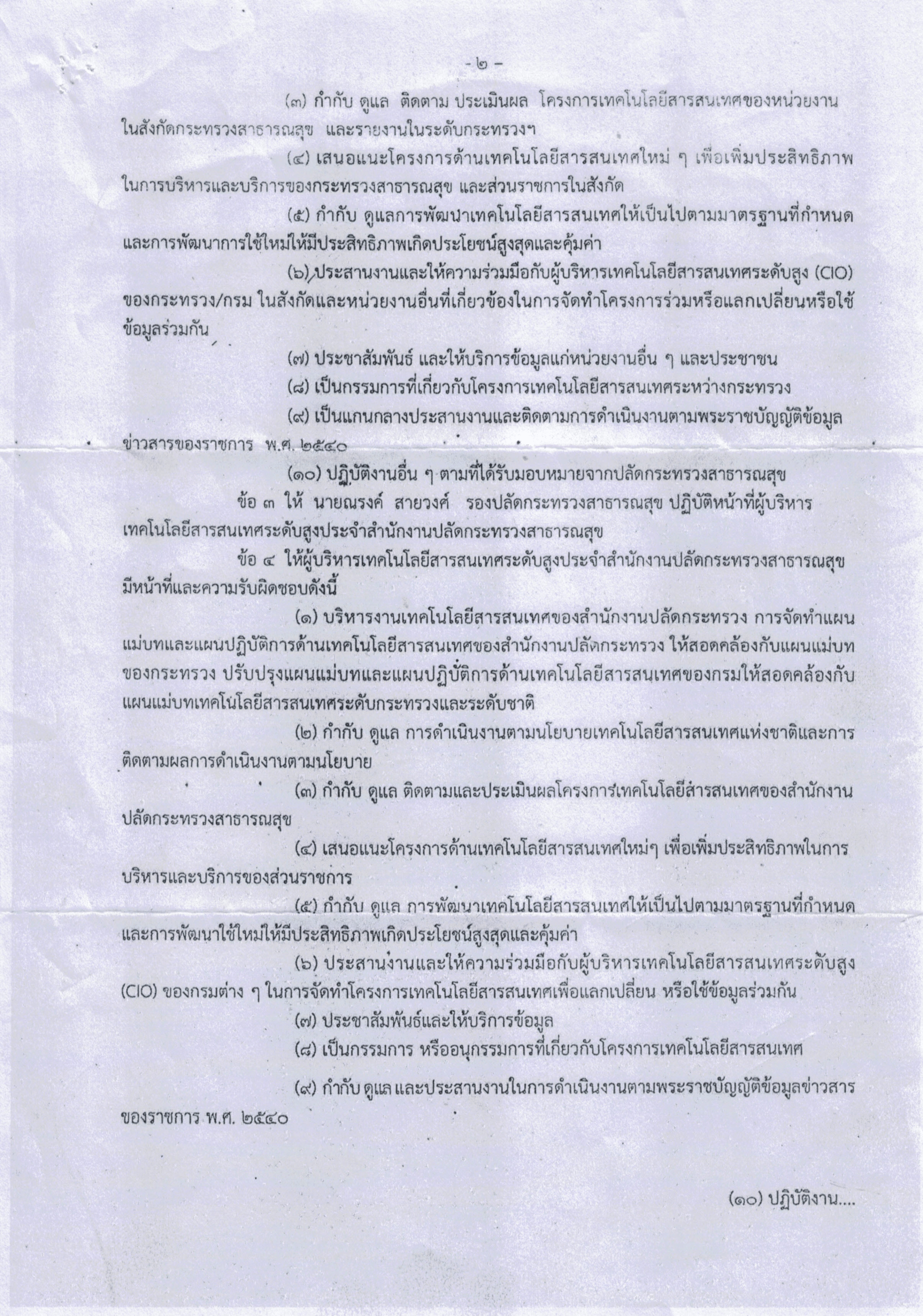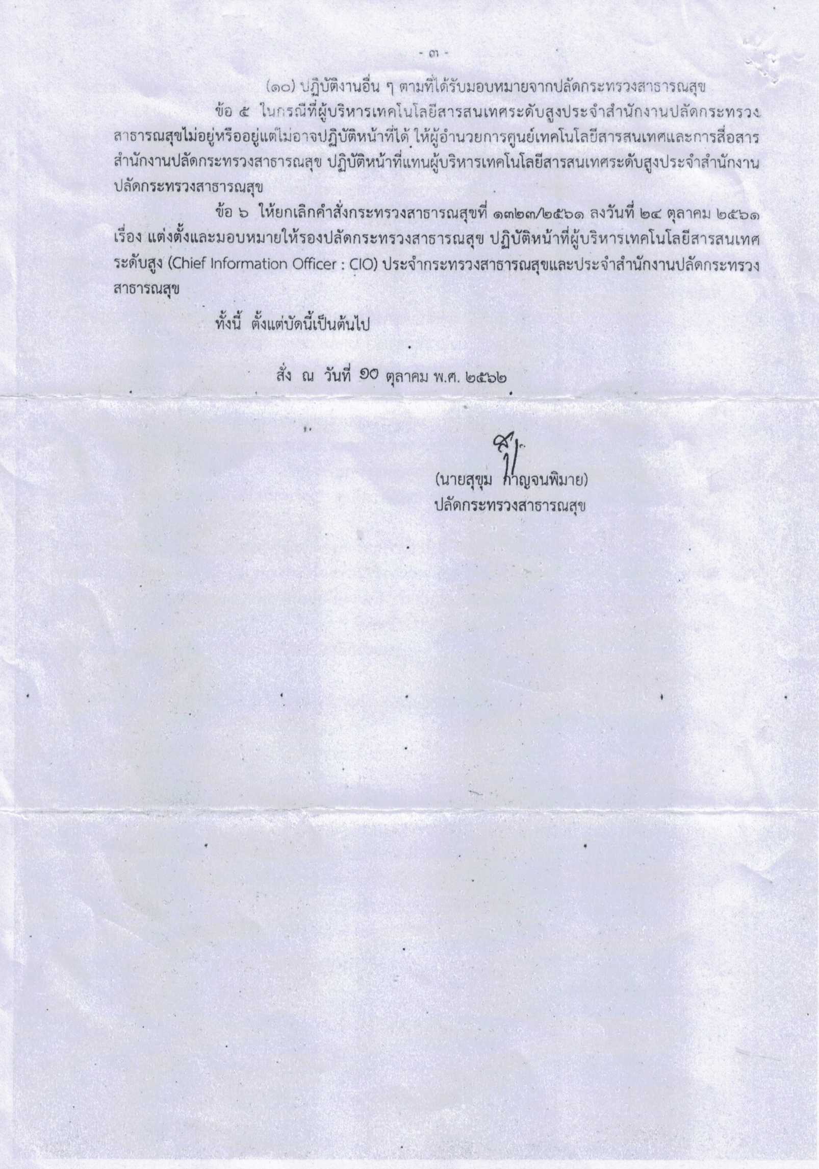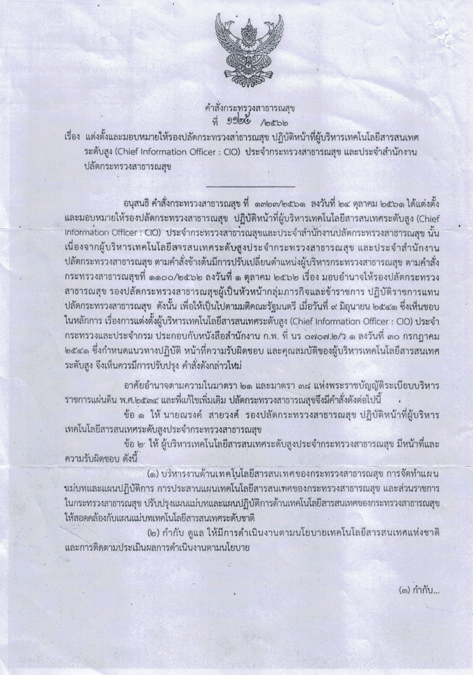 แต่งตั้งและมอบหมายให้รองปลัดกระทรวงสาธารณสุข ปฏิบัติหน้าที่ผู้บริหารเทคโนโลสารสนเทศ ระดับสูง(CIO)ประจำกระทรวงสาธารณสุข และประจำสำนักงานปลัดกระทรวงสาธารณสุข