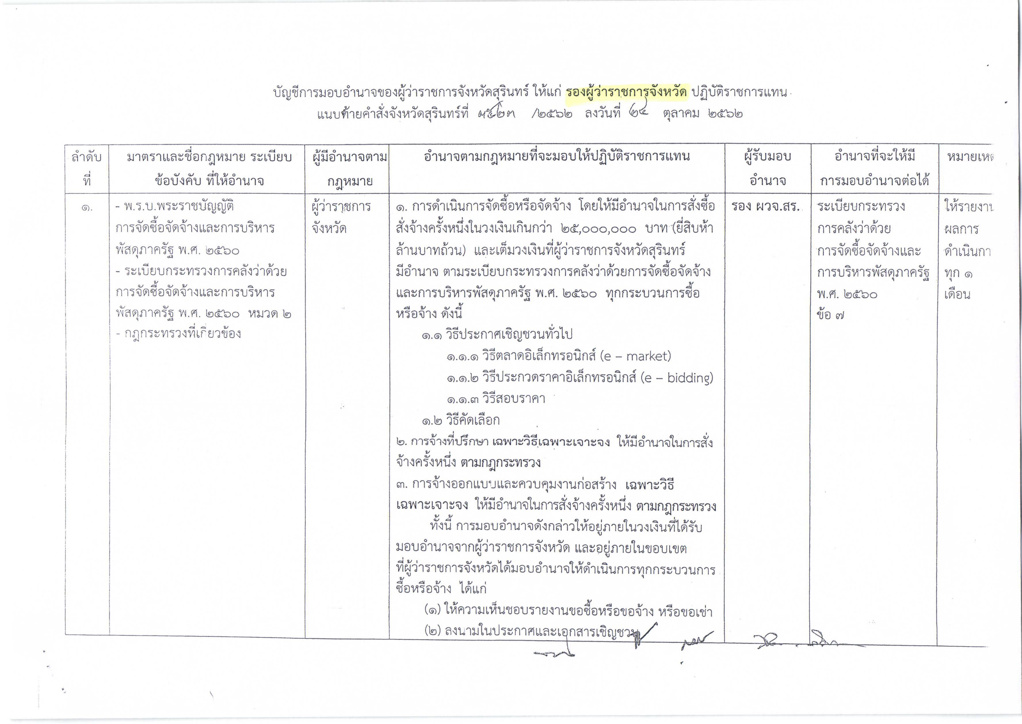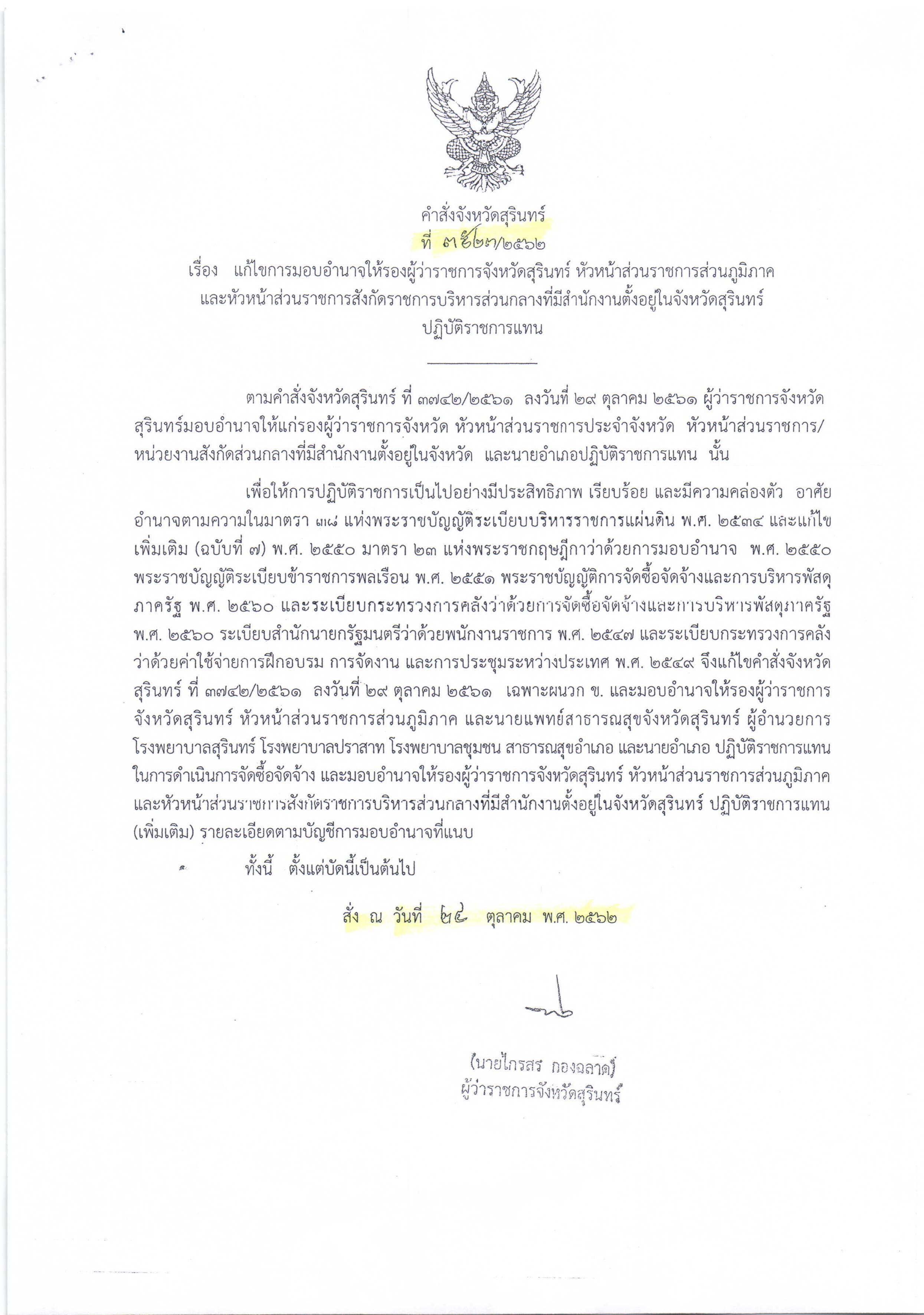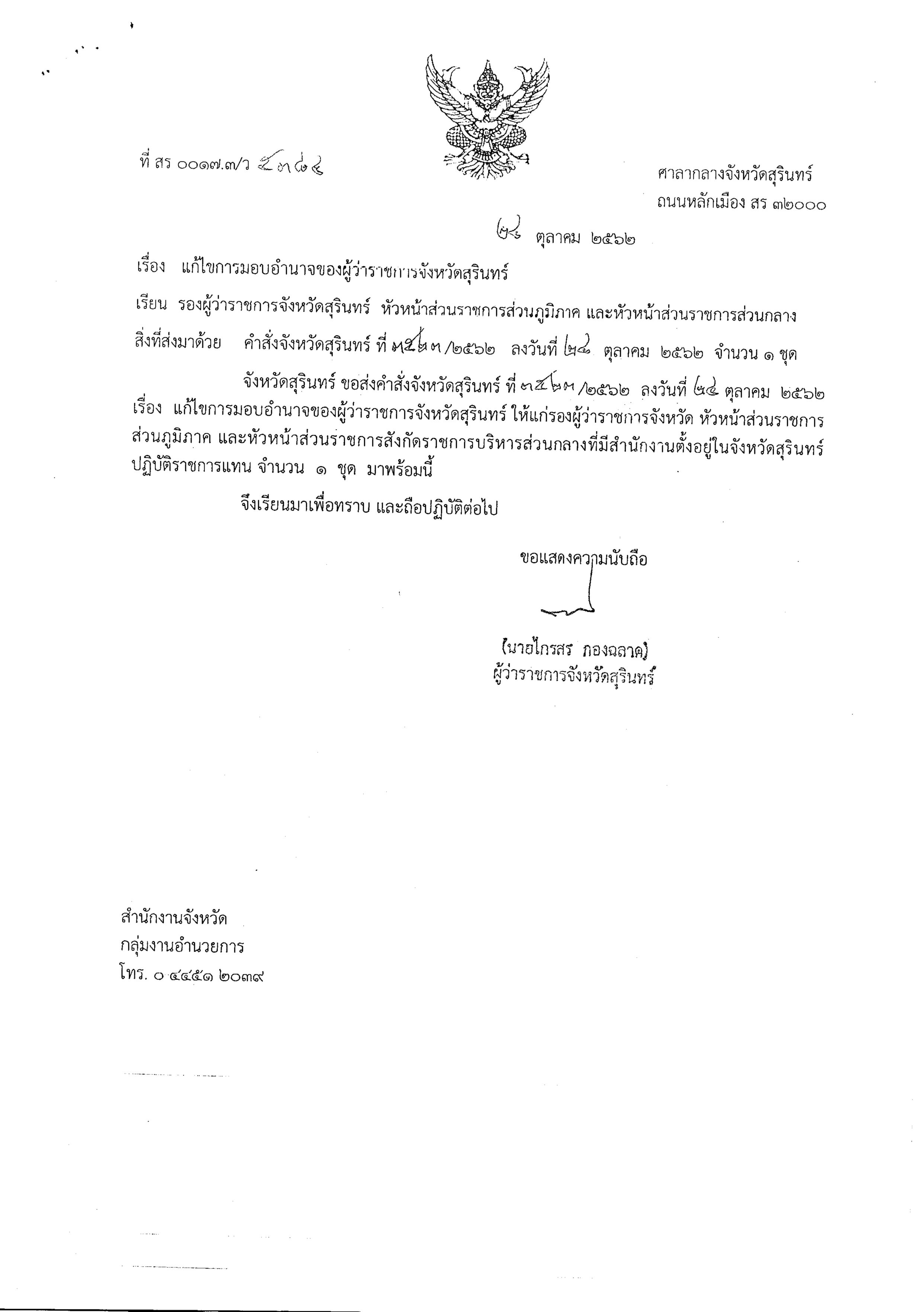 แก้ไขการมอบอำนาจให้รองผู้ว่าราชการจังหวัดสุรินทร์ หัวหน้าส่วนราชการส่วนภูมิภาค และหัวหน้าส่วนราชการสังกัดราชการบริหารส่วนกลางที่มีสำนักงานตั้งอยู่ในจังหวัดสุรินทร์ปฏิบัติราชการแทน
