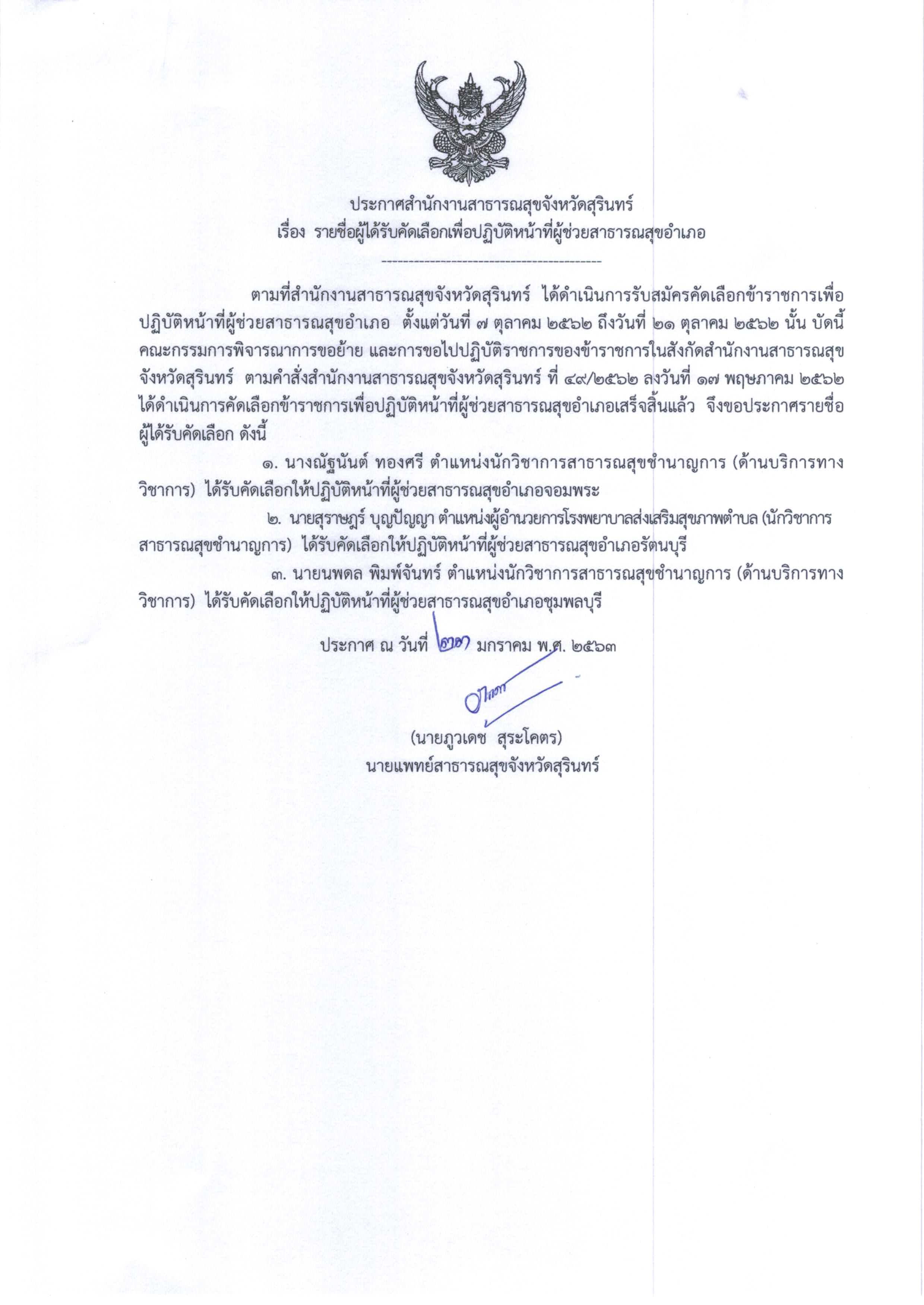 ประกาศสำนักงานสาธารณสุขจังหวัดสุรินทร์ เรื่อง รายชื่อผู้ได้รับคัดเลือกเพื่อปฏิบัติหน้าที่ผู้ช่วยสาธารณสุขอำเภอ