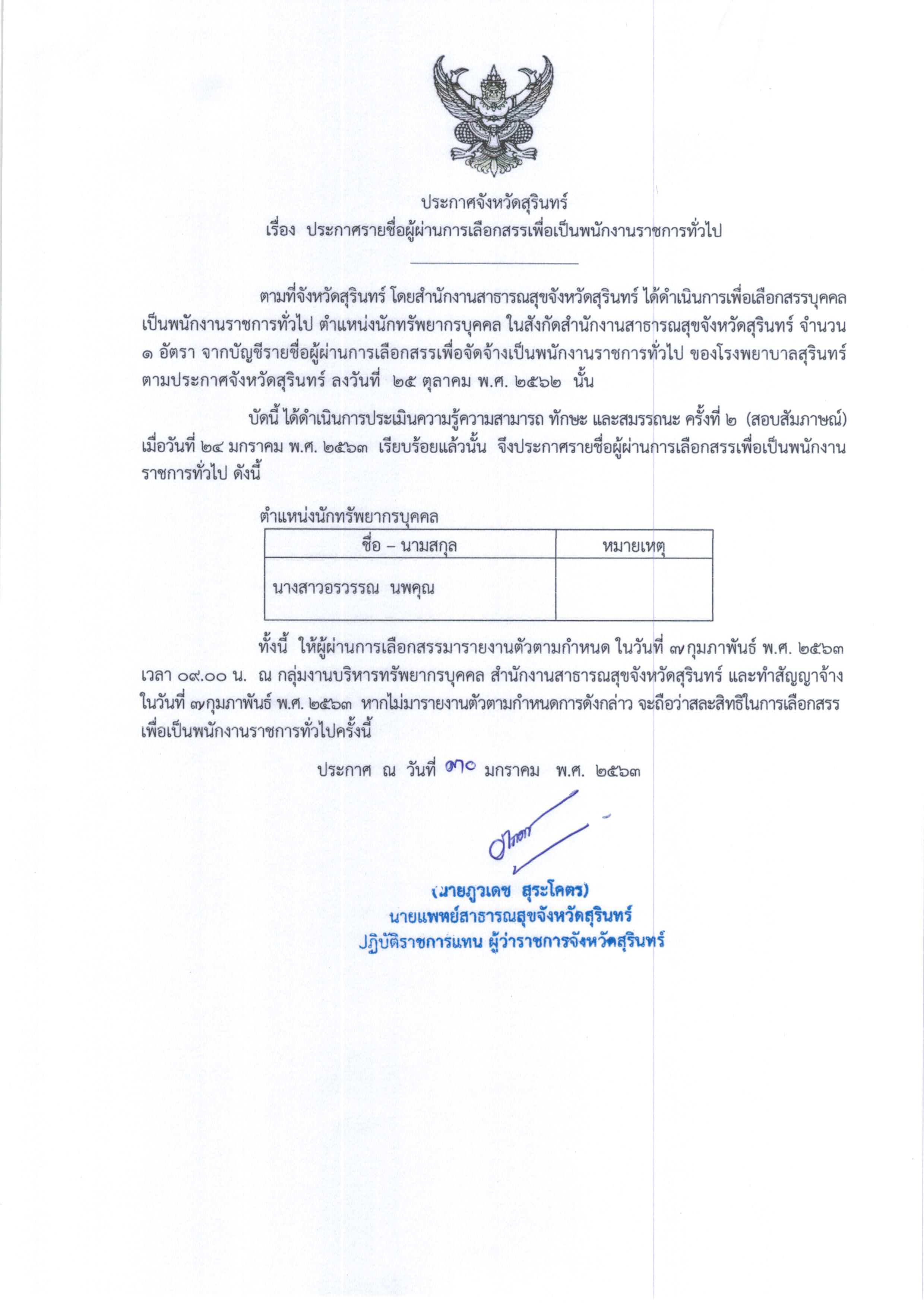 ประกาศรายชื่อผู้ผ่านการเลือกสรรเพื่อเป็นพนักงานราชการทั่วไป ตำแหน่งนักทรัพยากรบุคคล สสจ.สุรินทร์
