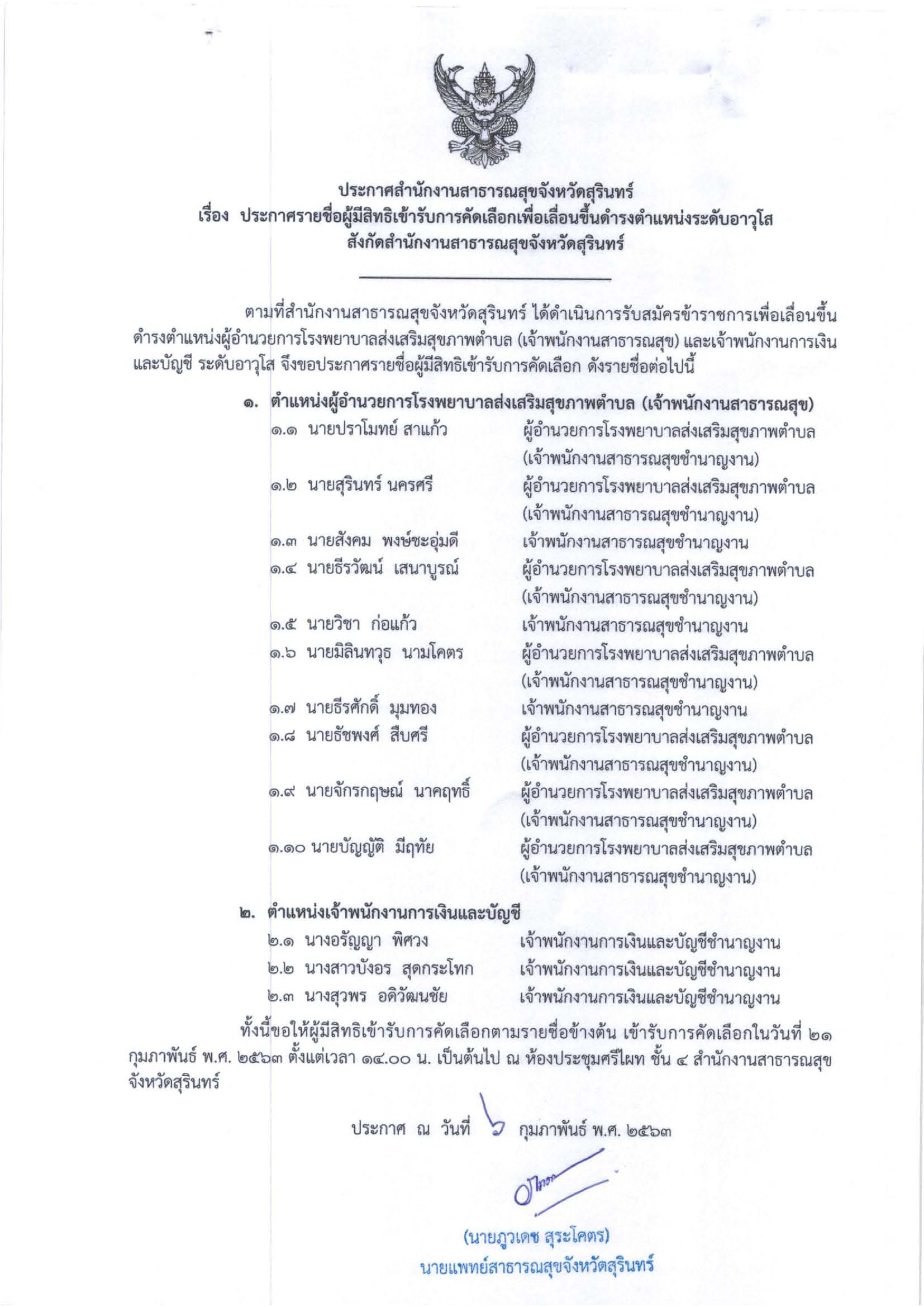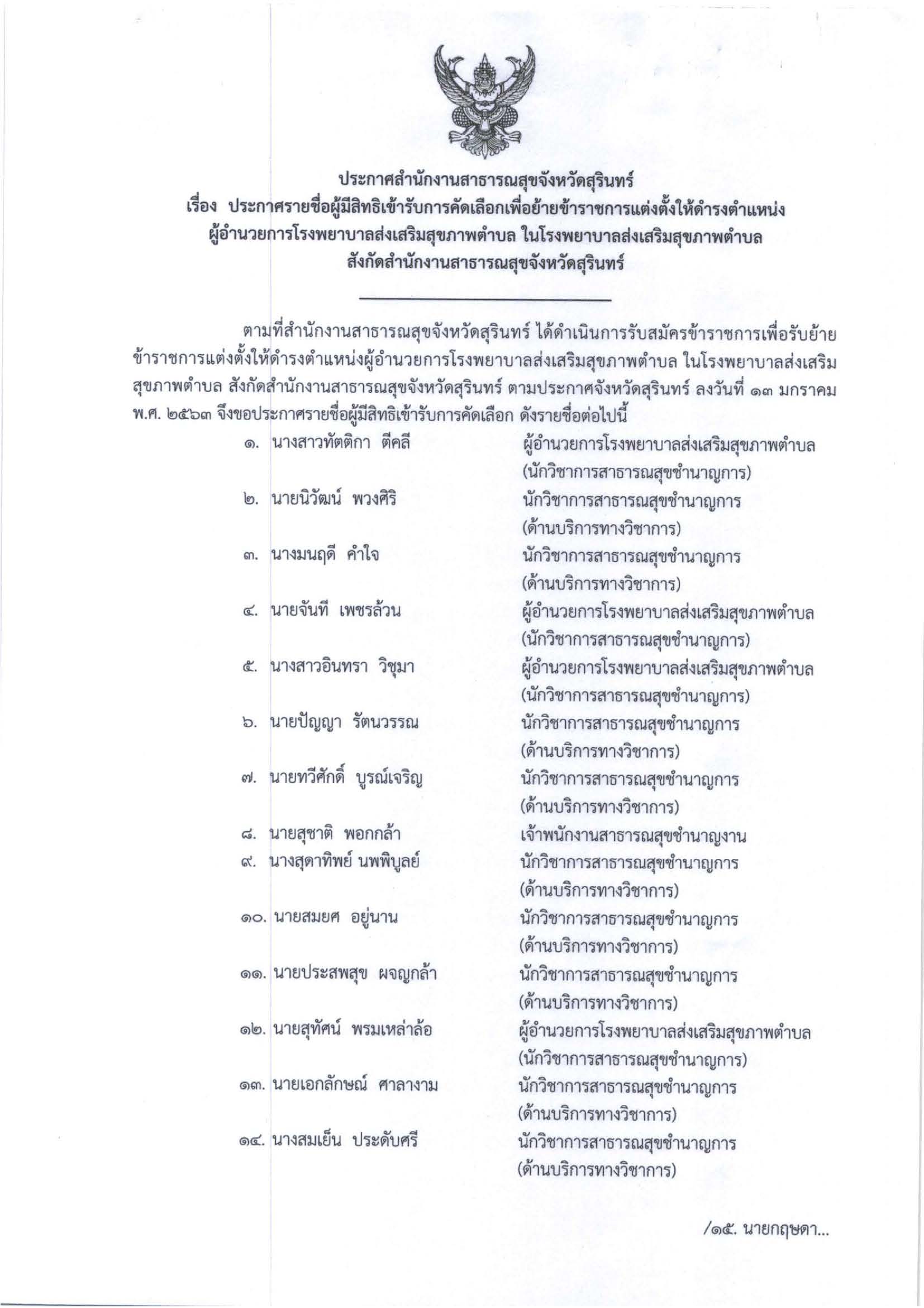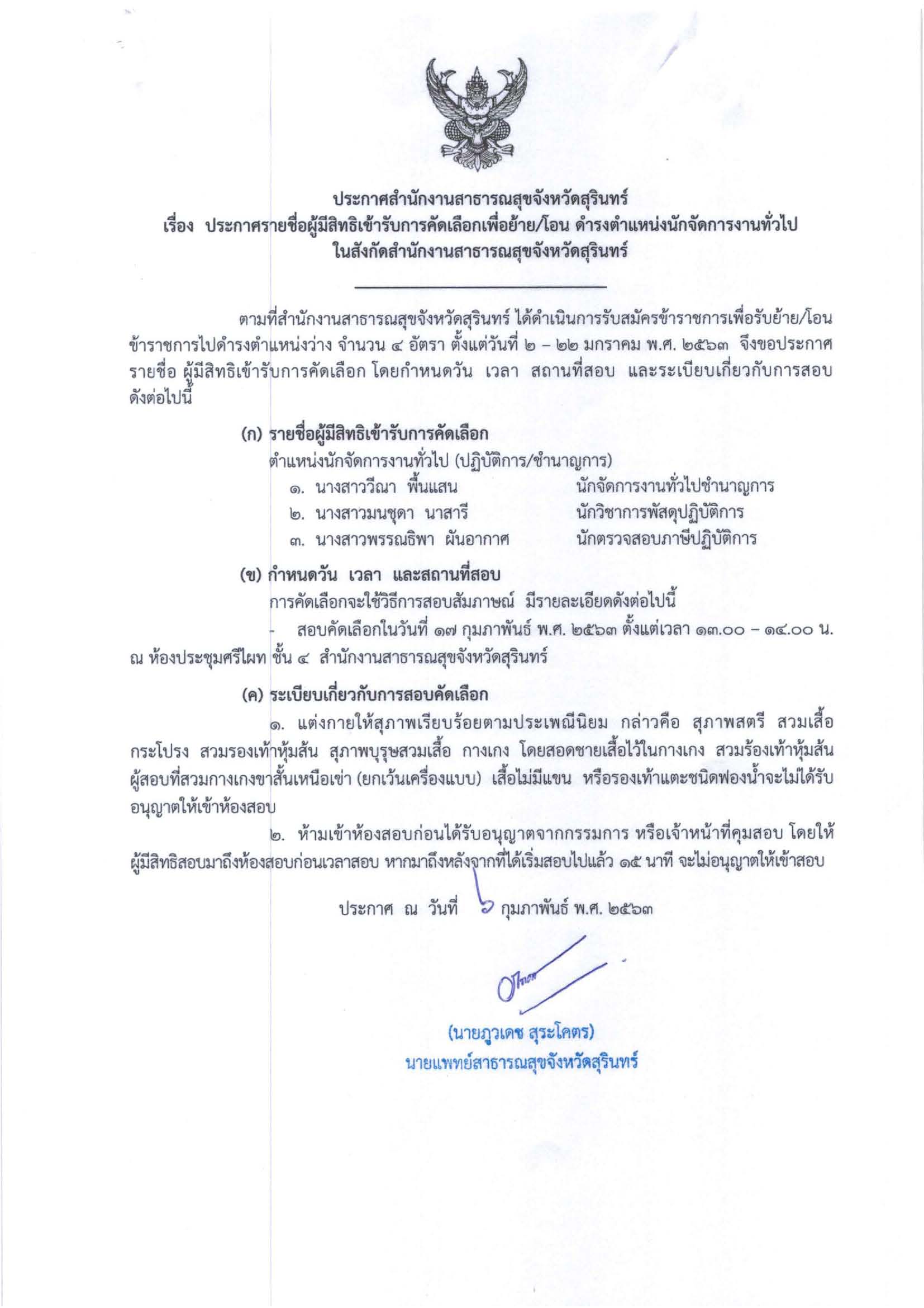 ประกาศรายชื่อผู้มีสิทธิเข้ารับการคัดเลือกเพื่อย้าย/โอน ดำรงตำแหน่งนักจัดการงานทั่วไป ในสังกัดสำนักงานสาธารณสุขจังหวัดสุรินทร์