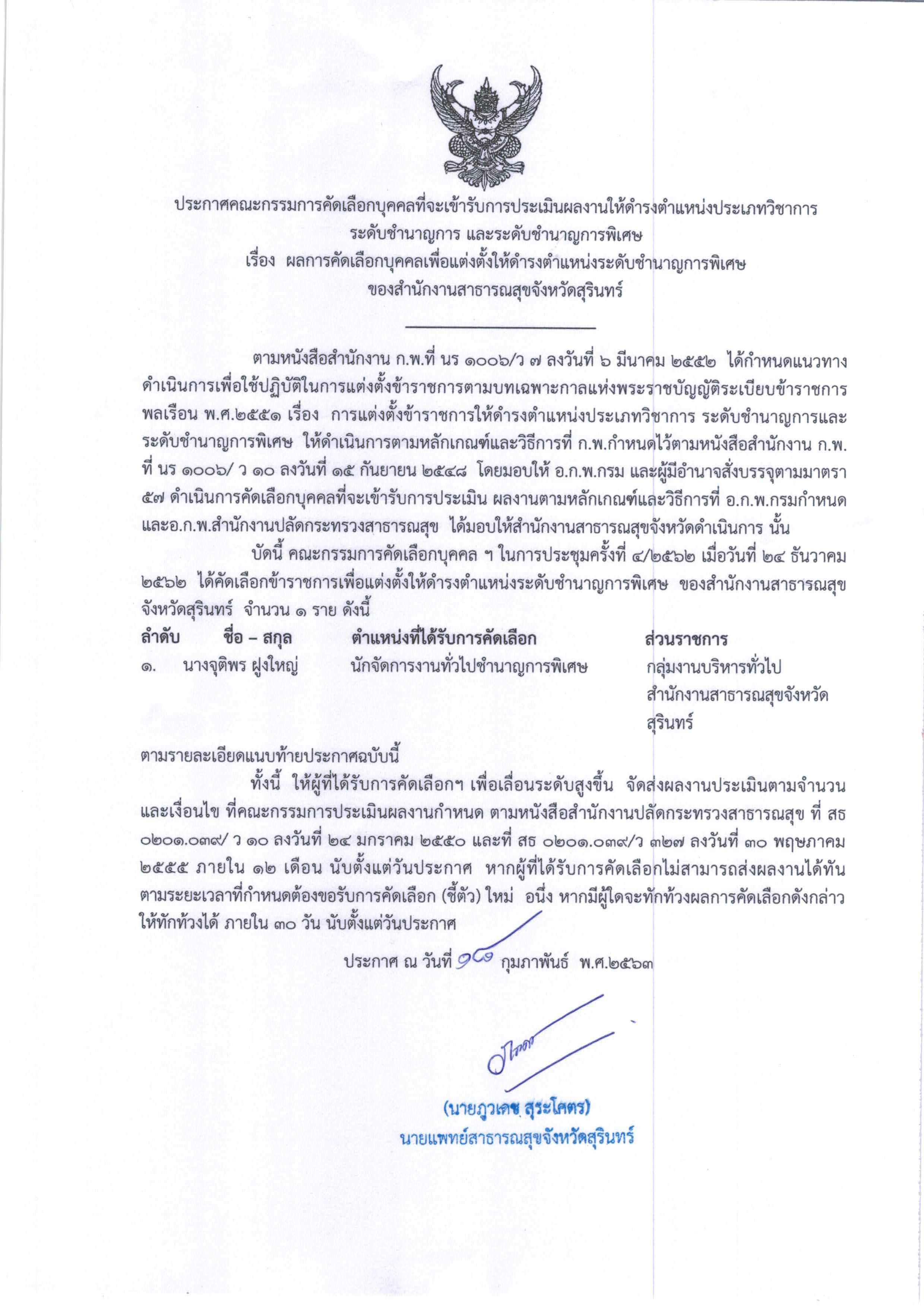 ผลการคัดเลือกบุคคลเพื่อแต่งตั้งให้ดำรงตำแหน่งระดับชำนาญการพิเศษ ของสำนักงานสาธารณสุขจังหวัดสุรินทร์