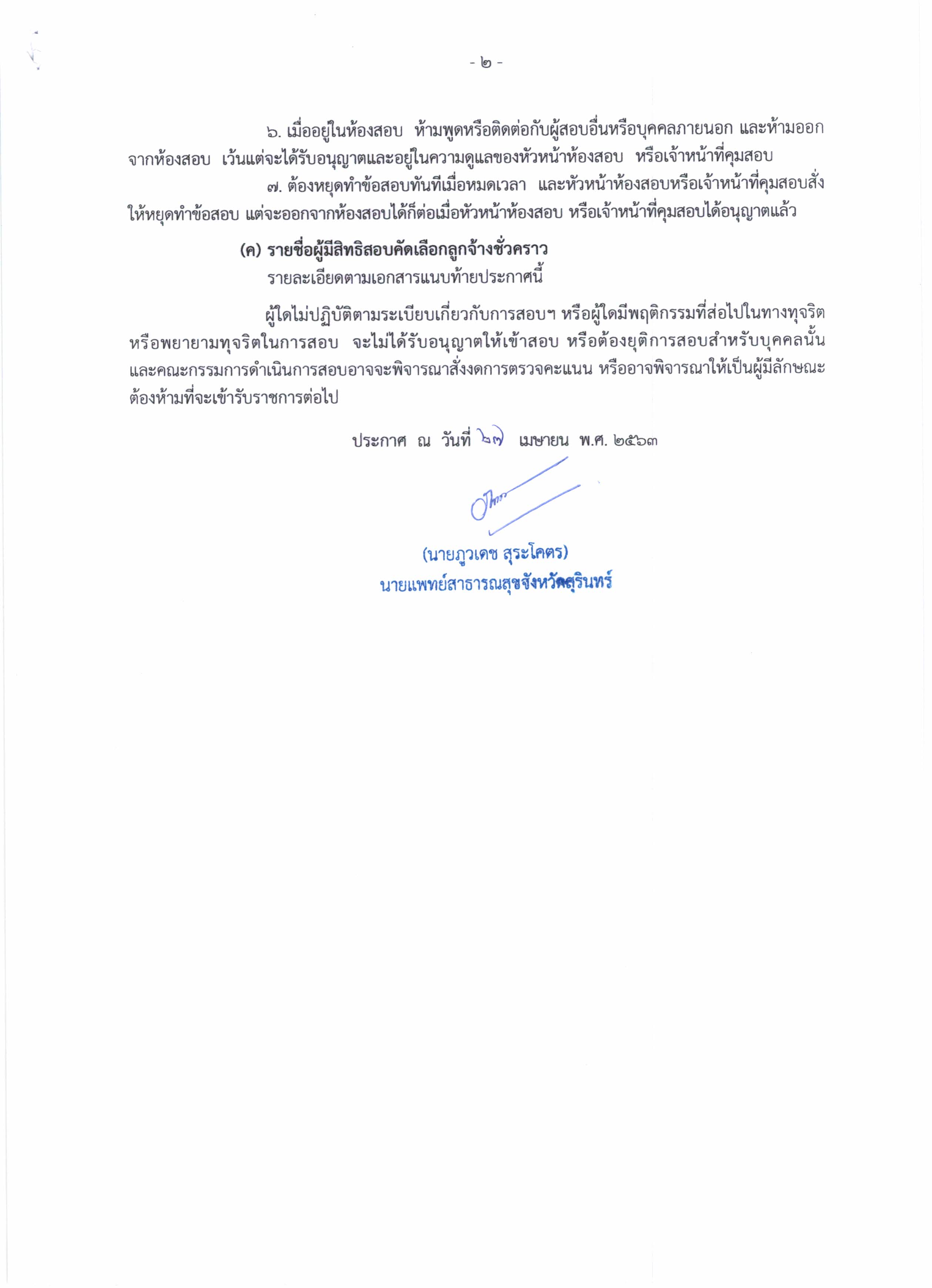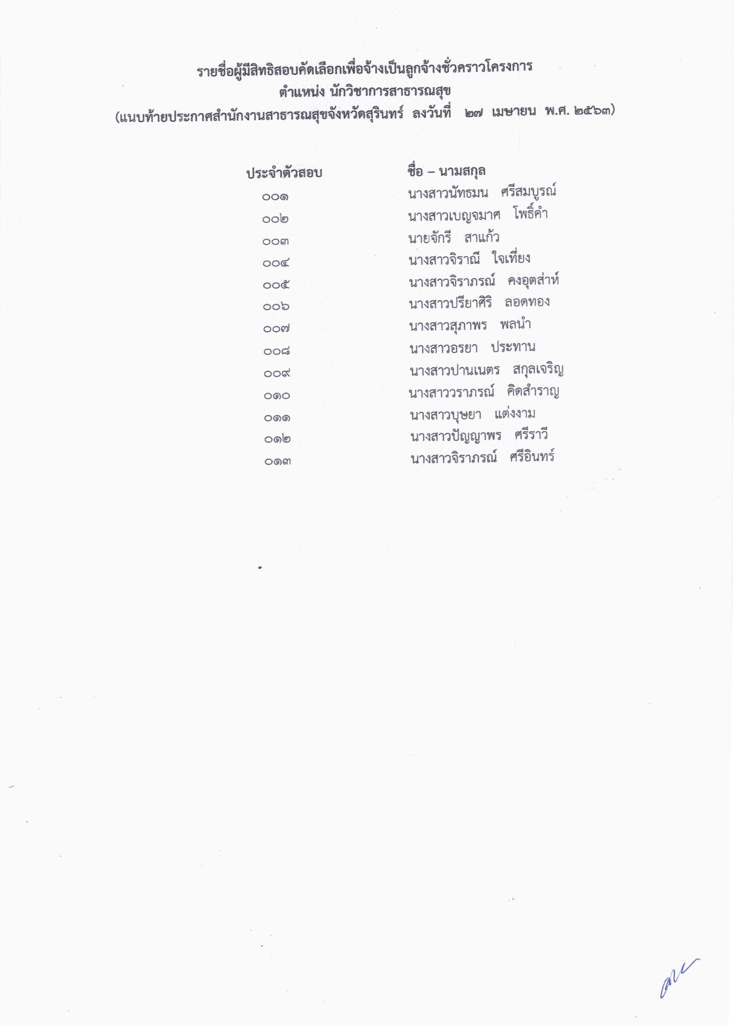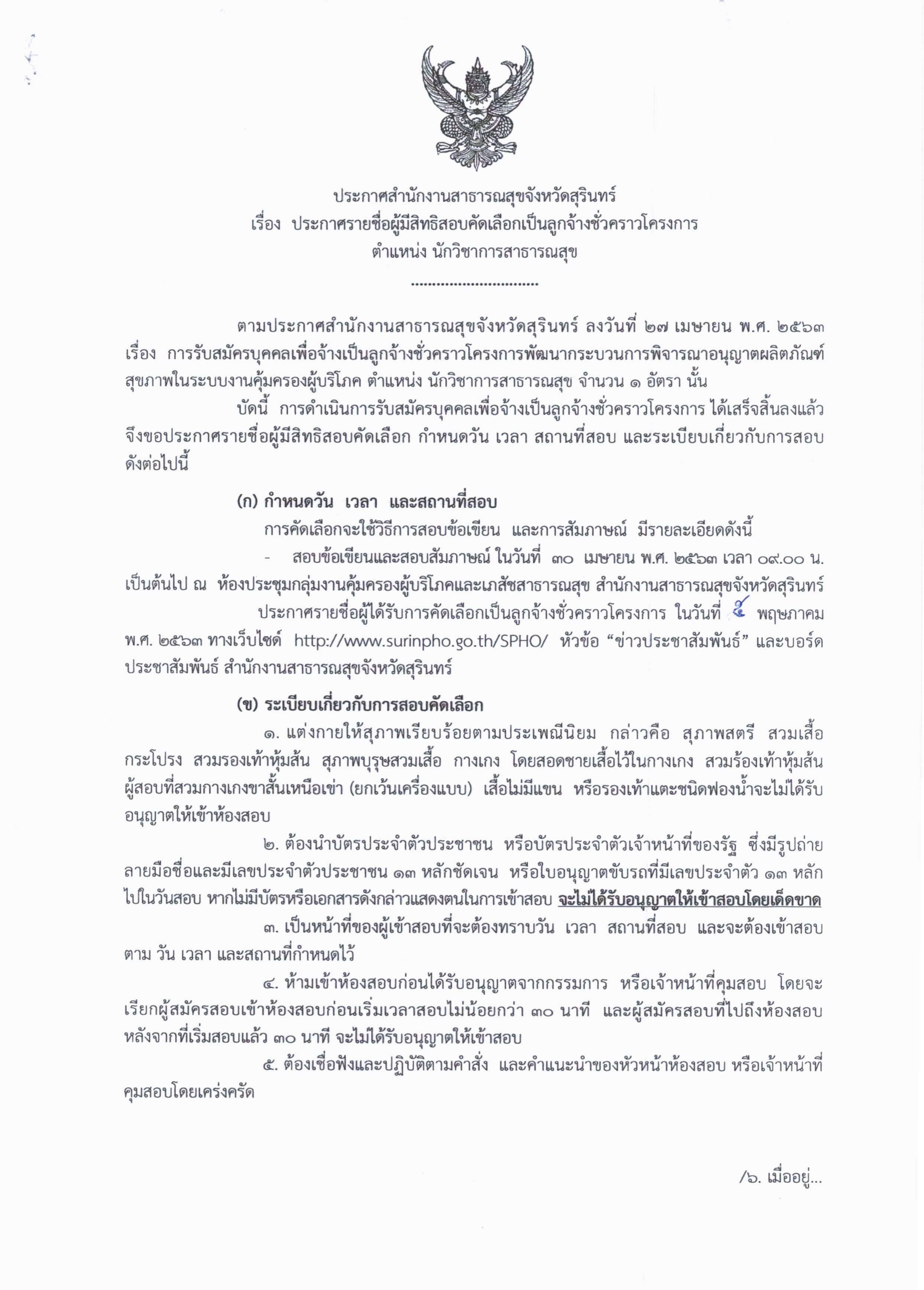 ประกาศรายชื่อผู้มีสิทธิสอบคัดเลือกเป็นลูกจ้างชั่วคราวโครงการ ตำแหนงนักวิชาการสาธารณสุข