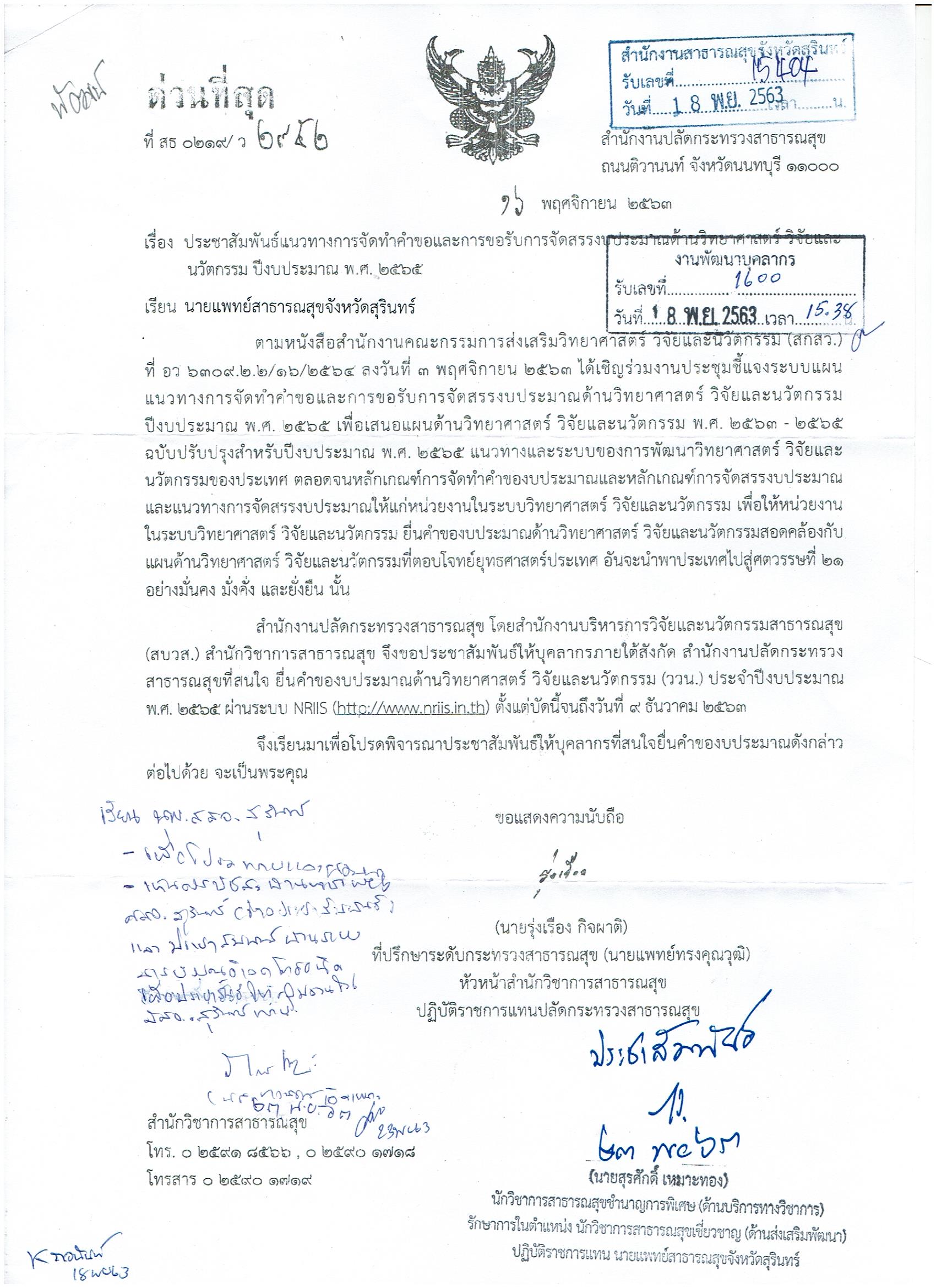 ด้วยสำนักงานปลัดกระทรวงสาธารณสุข โดยสำนักงานบริหารการวิจัยและนวัตกรรมสาธารณสุข(สบวส.) สำนักวิชาการสาธารณสุข จึงขอประชาสัมพันธ์ให้กับบุคลากรภายใต้สังกัด สำนักงานปลัดกระทรวงสาธารณสุขที่สนใจ ยื่นคำของบประมาณด้านวิทยาศาตร์ วิจัยและนวัตกรรม (ววน.) ประจำปีงบประมาณ พ.ศ. 2565 ผ่านระบบ NRIS (http://www.nris.in.th) ตั้งแต่บัดนี้จนถึงวันที่ 9 ธีนวาคม 2563